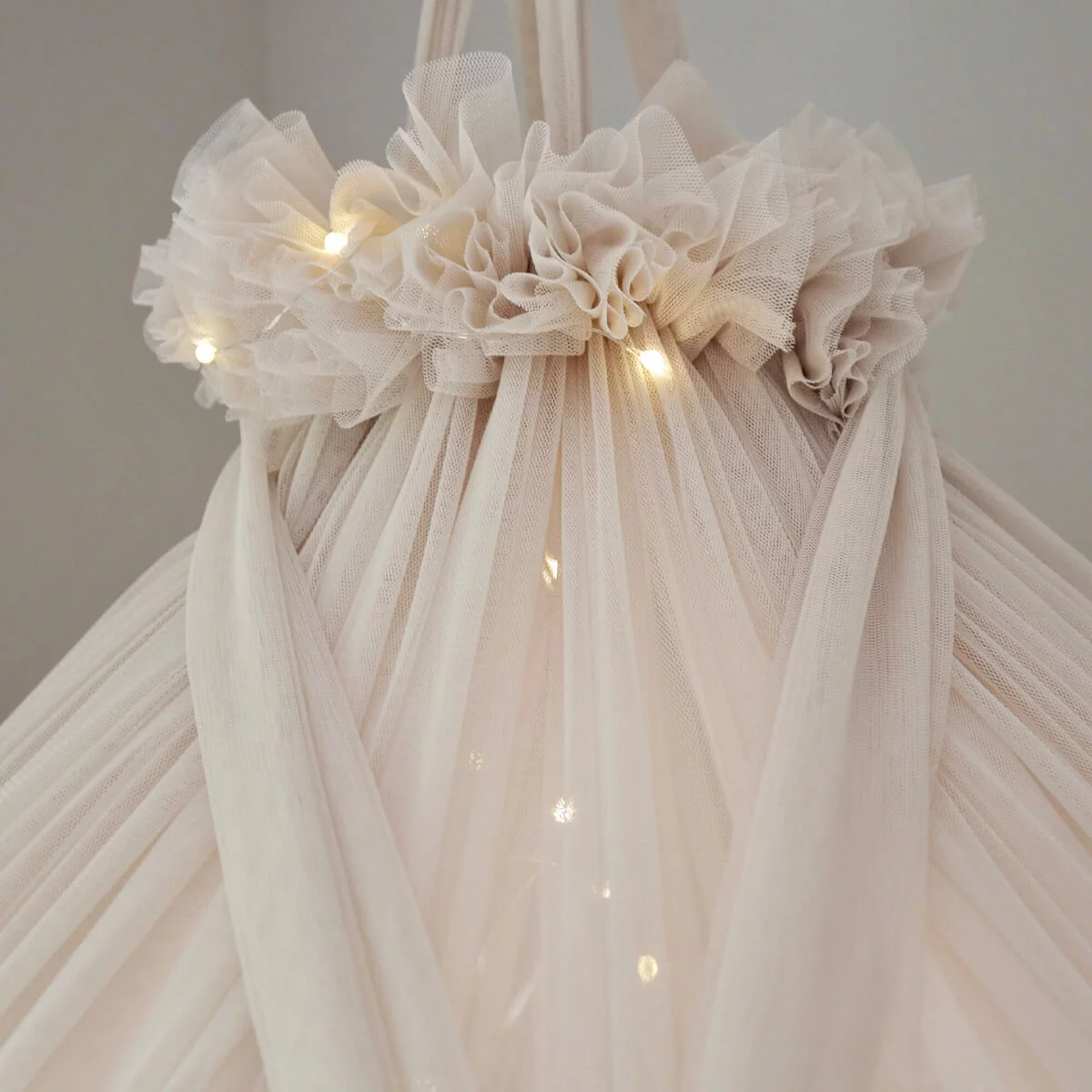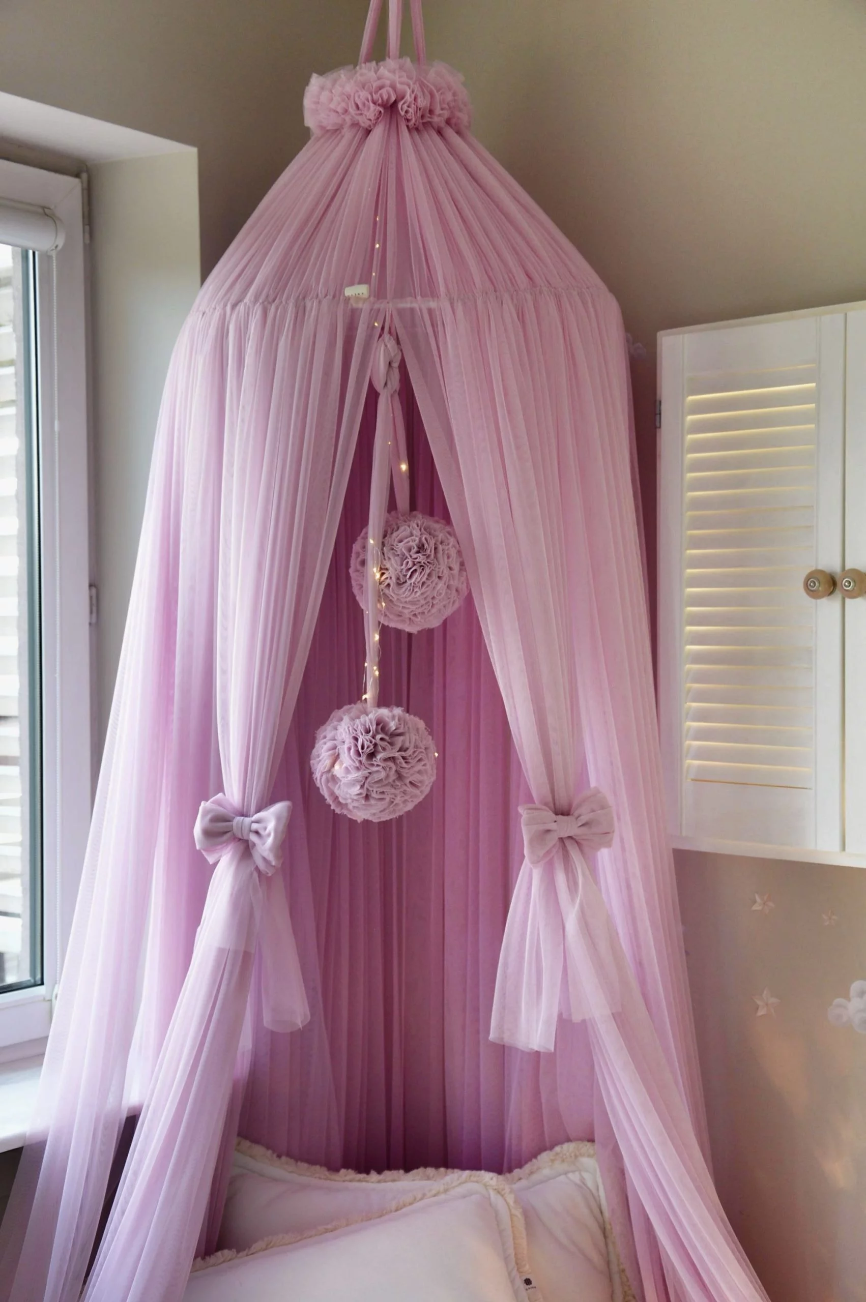 Χρησιμοποιήσαμε περίπου 20 μέτρα τούλι για να φτιάξουμε το canopy. Το Note Tulle προέρχεται από Πολωνό παραγωγό και είναι φτιαγμένο με τη μέγιστη προσοχή στην κάθε λεπτομέρεια.