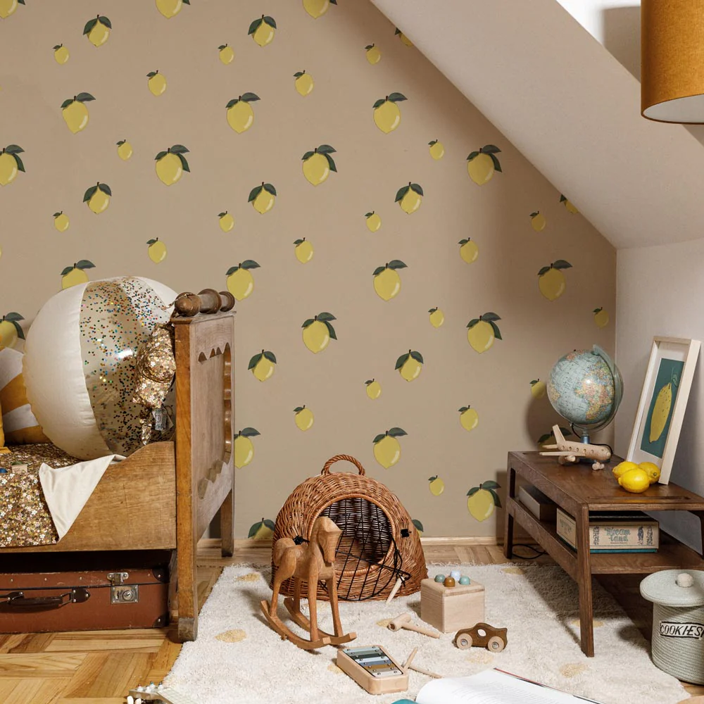 Επιλέξαμε ουδέτερο φόντο σε ανοιχτό βερικοκί χρώμα. Η ταπετσαρία λεμονιού ταιριάζει εύκολα με κάθε διακόσμηση παιδικού δωματίου. Συνδυάζεται άψογα με έπιπλα και χρώματα του χώρου.