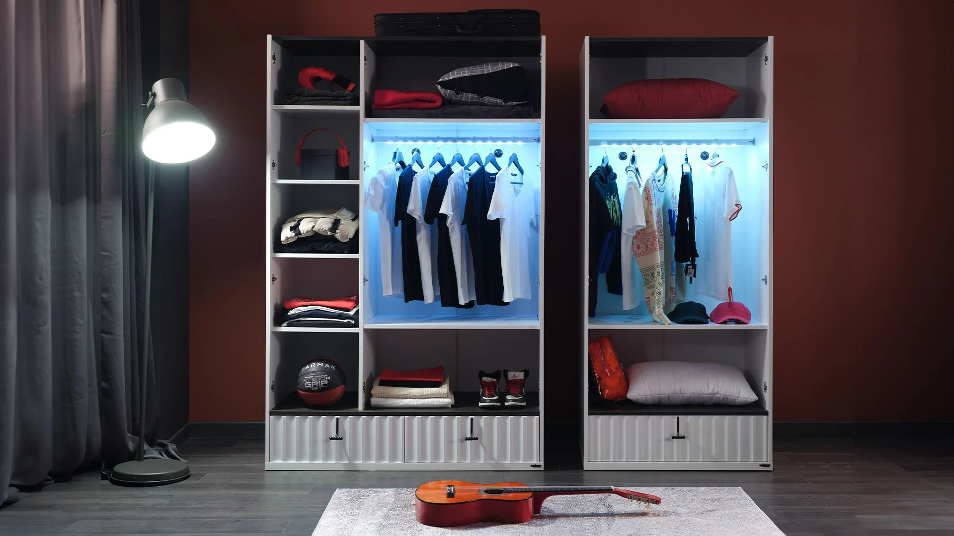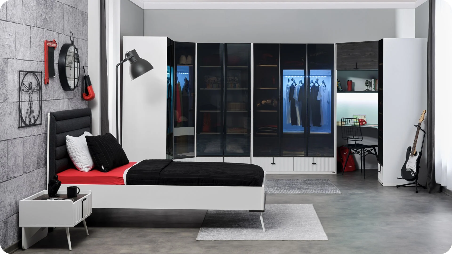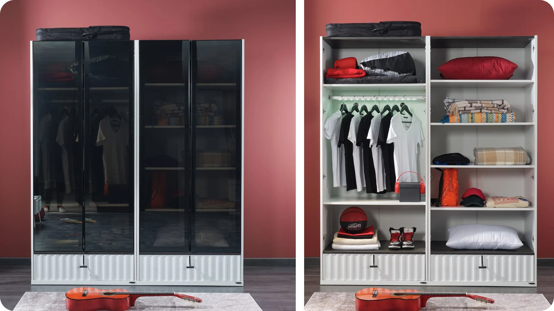 Η Δίφυλλη ντουλάπα με γυάλινη πόρτα Cool είναι αρκετά μεγάλη για να καλύψει τις ανάγκες του νέου και να έχει όλα του τα ρούχα πάντα τακτοποιημένα.
