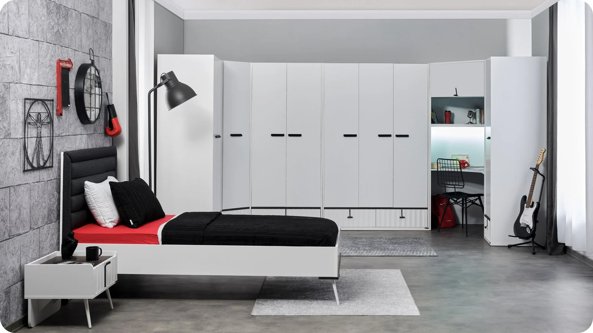 H Γωνιακό γραφείο με ντουλάπι Cool είναι αρκετά μεγάλη για να καλύψει τις ανάγκες του νέου και να έχει όλα του τα ρούχα πάντα τακτοποιημένα. Χαρακτηριστικά & Προνόμια * Μοριοσανίδα γενικής χρήσης με επικάλυψη μελαμίνης * Μεντεσέδες άνω καλύμματος με πώμα και έμβολο * Φωτισμός LED ημέρας ευαίσθητος στην αφή στο τμήμα εργασίας. * Διατίθεται συσκευή στερέωσης σε τοίχο για την ασφάλεια σεισμών και παιδιών. Συμπεριλαμβάνονται