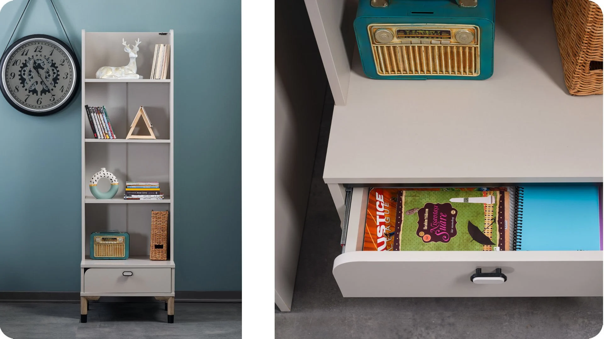 - Ανοιχτά ράφια για εύκολη πρόσβαση σε βιβλία, φακέλους και διακοσμητικά.