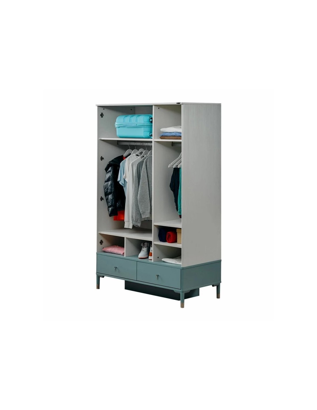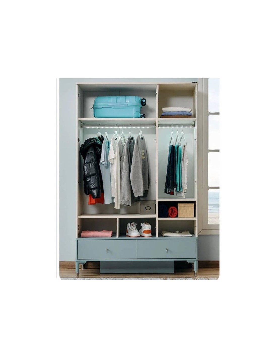 Η ντουλάπα της φωτογραφίας είναι μια κομψή και πρακτική επιλογή για παιδικά ή εφηβικά δωμάτια, σχεδιασμένη με έμφαση στη λειτουργικότητα και το μοντέρνο στυλ. Κατασκευασμένη σε δίχρωμο συνδυασμό λευκού και σιέλ, συνδυάζει αισθητική φρεσκάδα και αρμονία, ιδανική για να ταιριάξει με κάθε διακόσμηση.