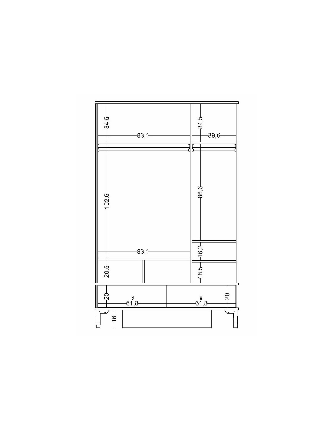 Η ντουλάπα διαθέτει τρία φύλλα που ανοίγουν για να αποκαλύψουν έναν ευρύχωρο εσωτερικό χώρο οργάνωσης. Περιλαμβάνει: