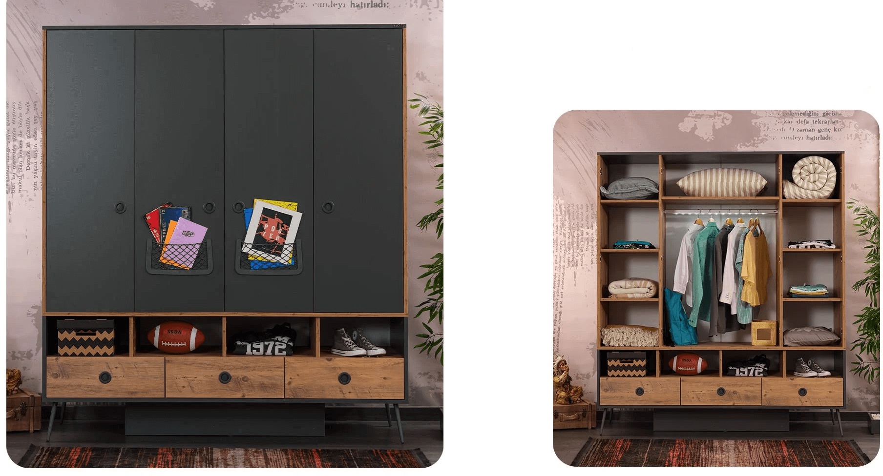 Η Τετράφυλλη Ντουλάπα Nirvana διαθέτει ράγες, ράφια και συρτάρια με μηχανισμούς soft-close για αθόρυβη χρήση, και ταιριάζει σε κάθε παιδικο ή/και εφηβικό υπνοδωμάτιο.