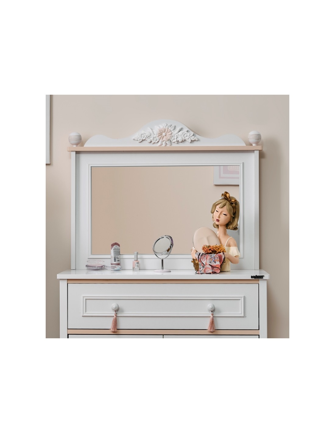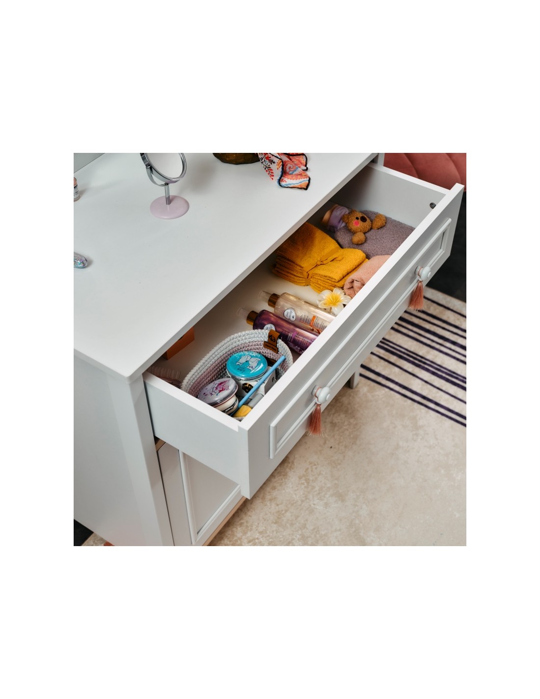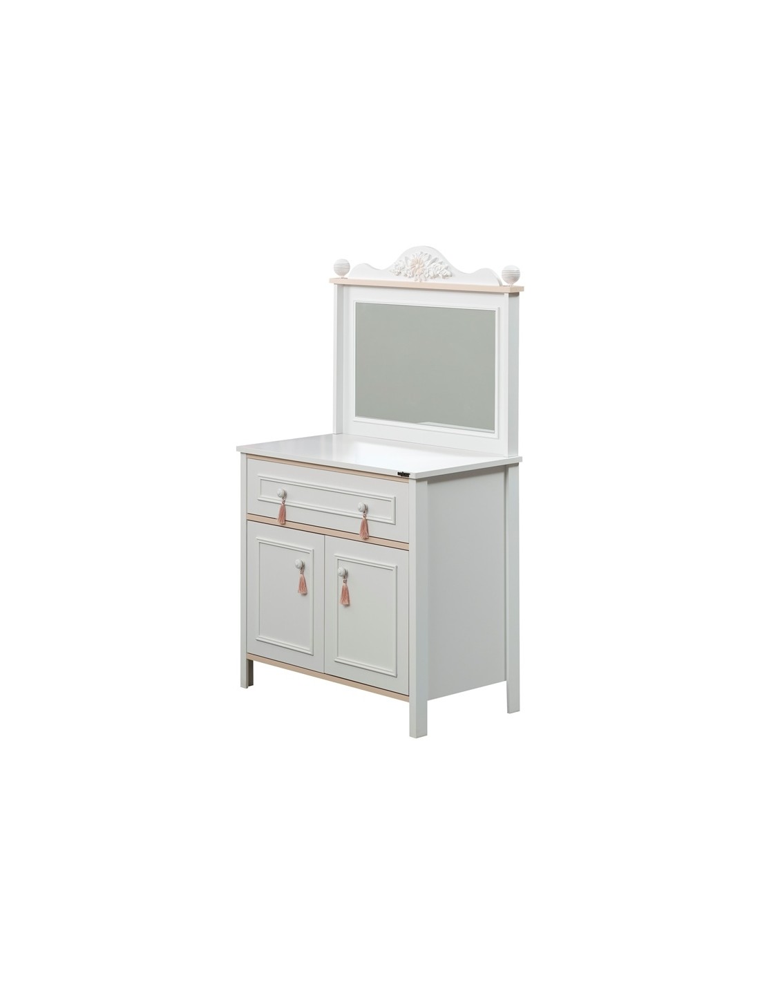 Διαθέτει δύο ευρύχωρα ντουλάπια για αποθήκευση ρούχων, αξεσουάρ ή άλλων αντικειμένων, ένα μεγάλο συρτάρι καθώς και έναν πρακτικό καθρέπτη στην επάνω επιφάνεια κατόπιν επιλογής.