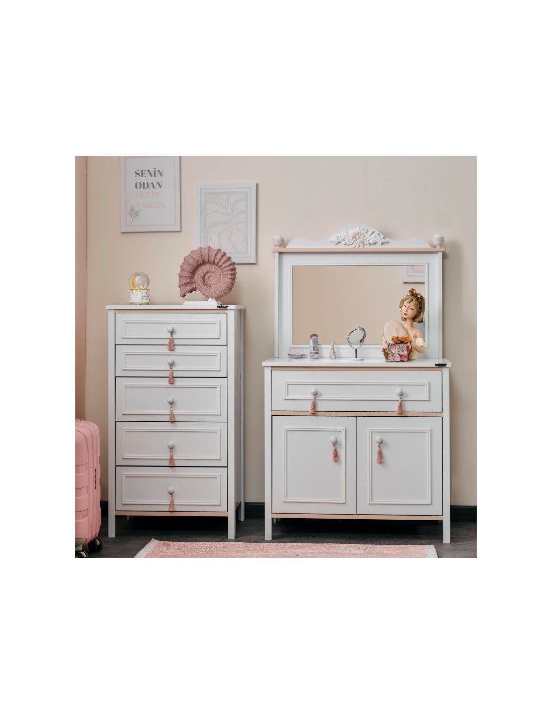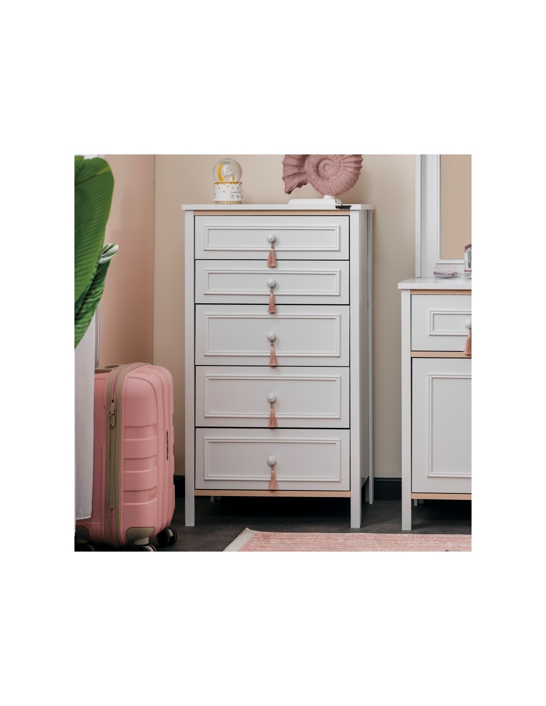 Διαθέτει πέντε ευρύχωρα συρτάρια σε διακριτικό λευκό χρώμα, με επάνω συρτάρι σε απαλό ροζ, που προσδίδουν μια ρομαντική και μοντέρνα πινελιά.