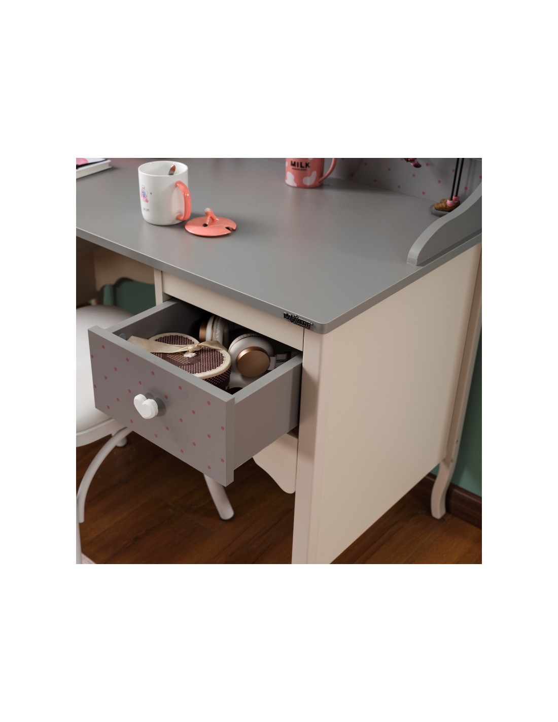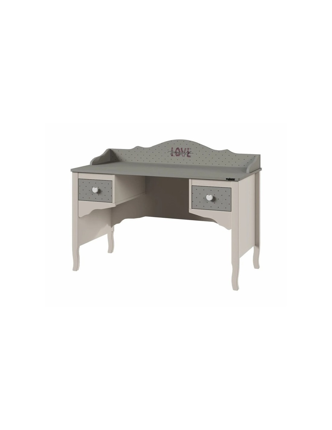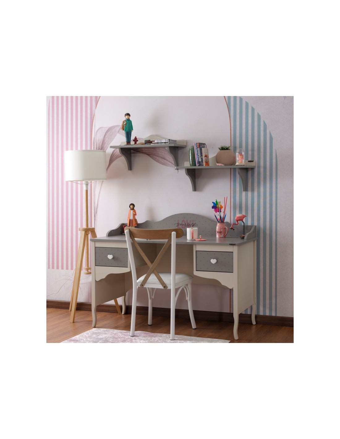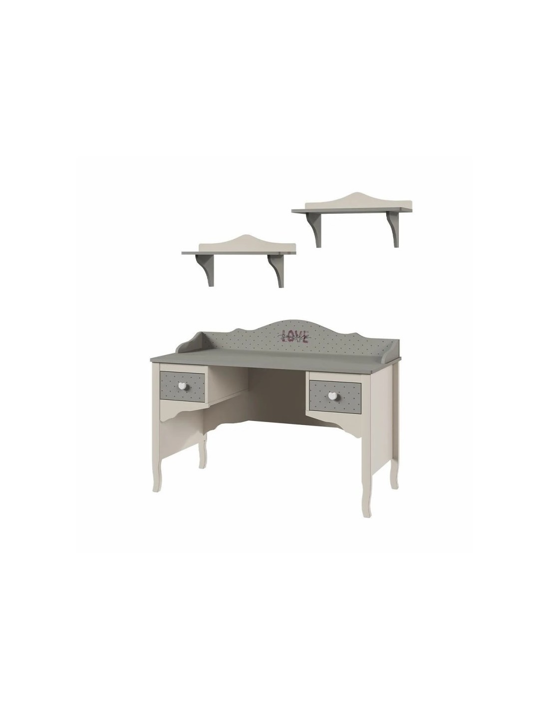Το γραφείο Juliet είναι μια κομψή και πρακτική επιλογή για παιδικά και εφηβικά δωμάτια, που συνδυάζει ρομαντική αισθητική και λειτουργικότητα. Ο σχεδιασμός του, με καμπύλες γραμμές και λεπτομέρειες σε γκρι και κρεμ τόνους, προσδίδει μια ζεστή και καλαίσθητη αίσθηση στο χώρο.