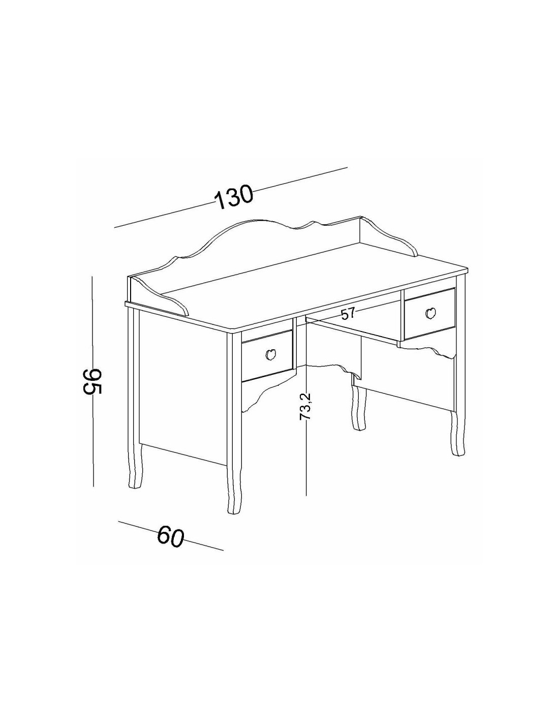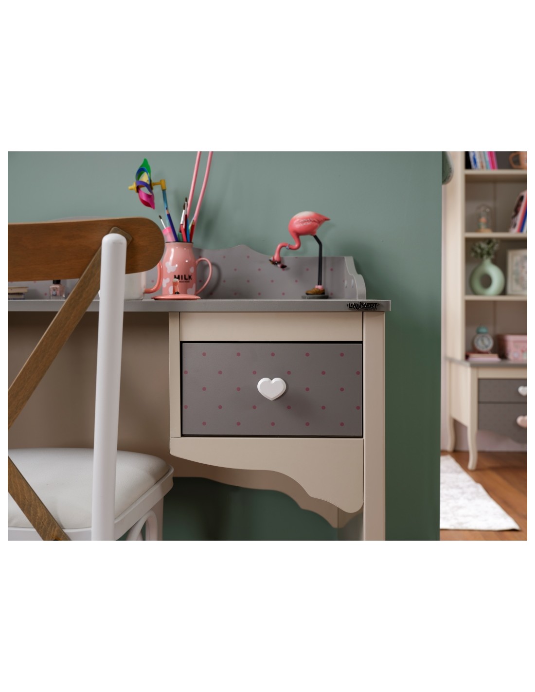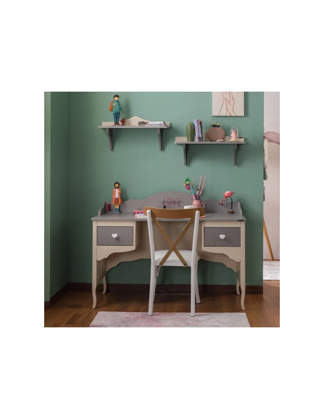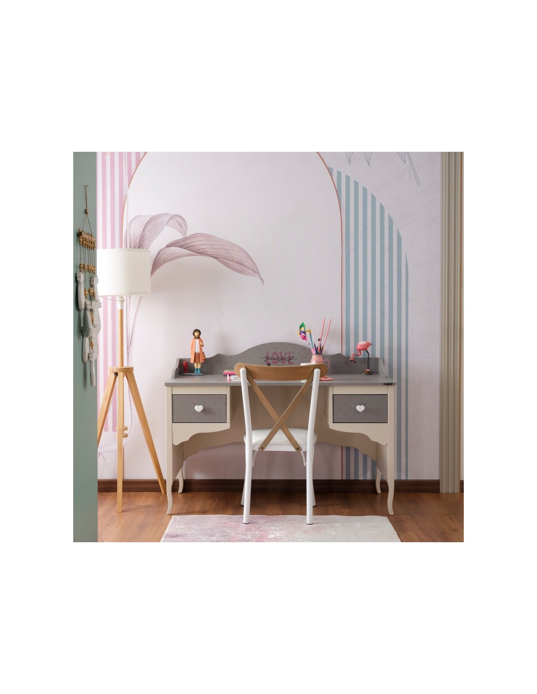 Διαθέτει δύο συρτάρια με διακριτικά μοτίβα και λαβές σε σχήμα καρδιάς, ιδανικά για την αποθήκευση γραφικής ύλης, βιβλίων ή προσωπικών αντικειμένων. Η ευρύχωρη επιφάνεια εργασίας παρέχει άνεση για διάβασμα, μελέτη ή δημιουργικές δραστηριότητες, ενώ το πίσω διακοσμητικό πάνελ φέρει τη λέξη “LOVE yourself”, ενισχύοντας τη μοναδικότητα του σχεδιασμού.