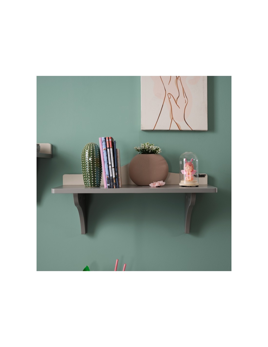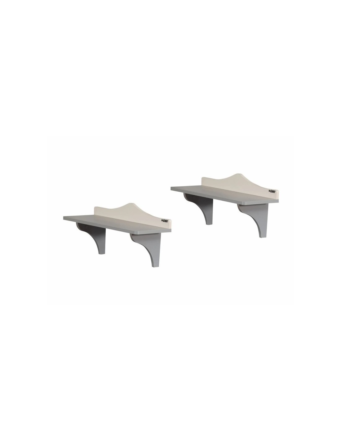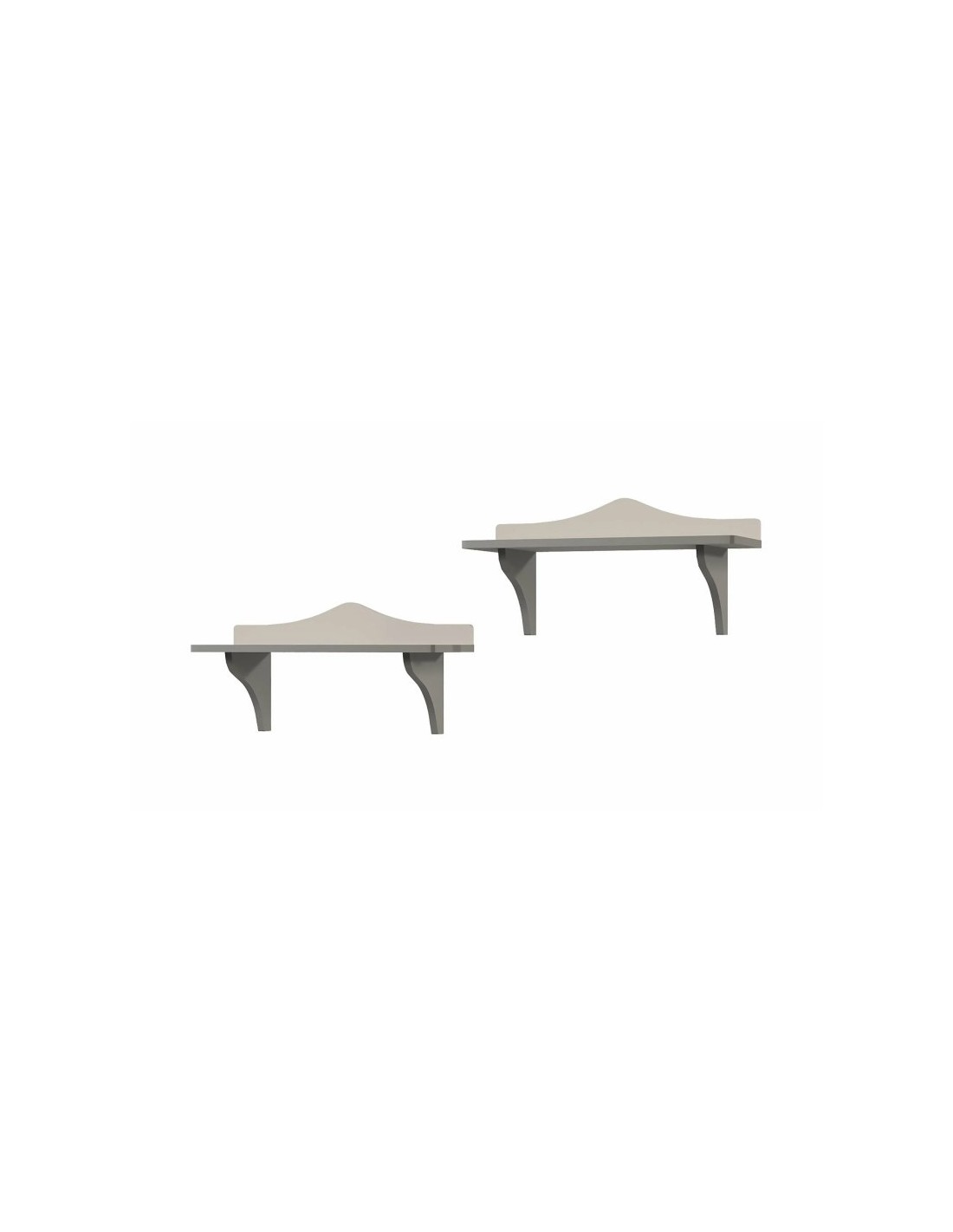 Το σετ περιλαμβάνει δύο ράφια σε απαλή κρεμ / γκρι απόχρωση, με καμπυλωτές λεπτομέρειες που προσθέτουν μια ξεχωριστή διακοσμητική πινελιά. Τα ράφια είναι ιδανικά για την τοποθέτηση βιβλίων, διακοσμητικών αντικειμένων ή προσωπικών συλλογών, ενώ τα στιβαρά τους στηρίγματα εξασφαλίζουν σταθερότητα και αντοχή.