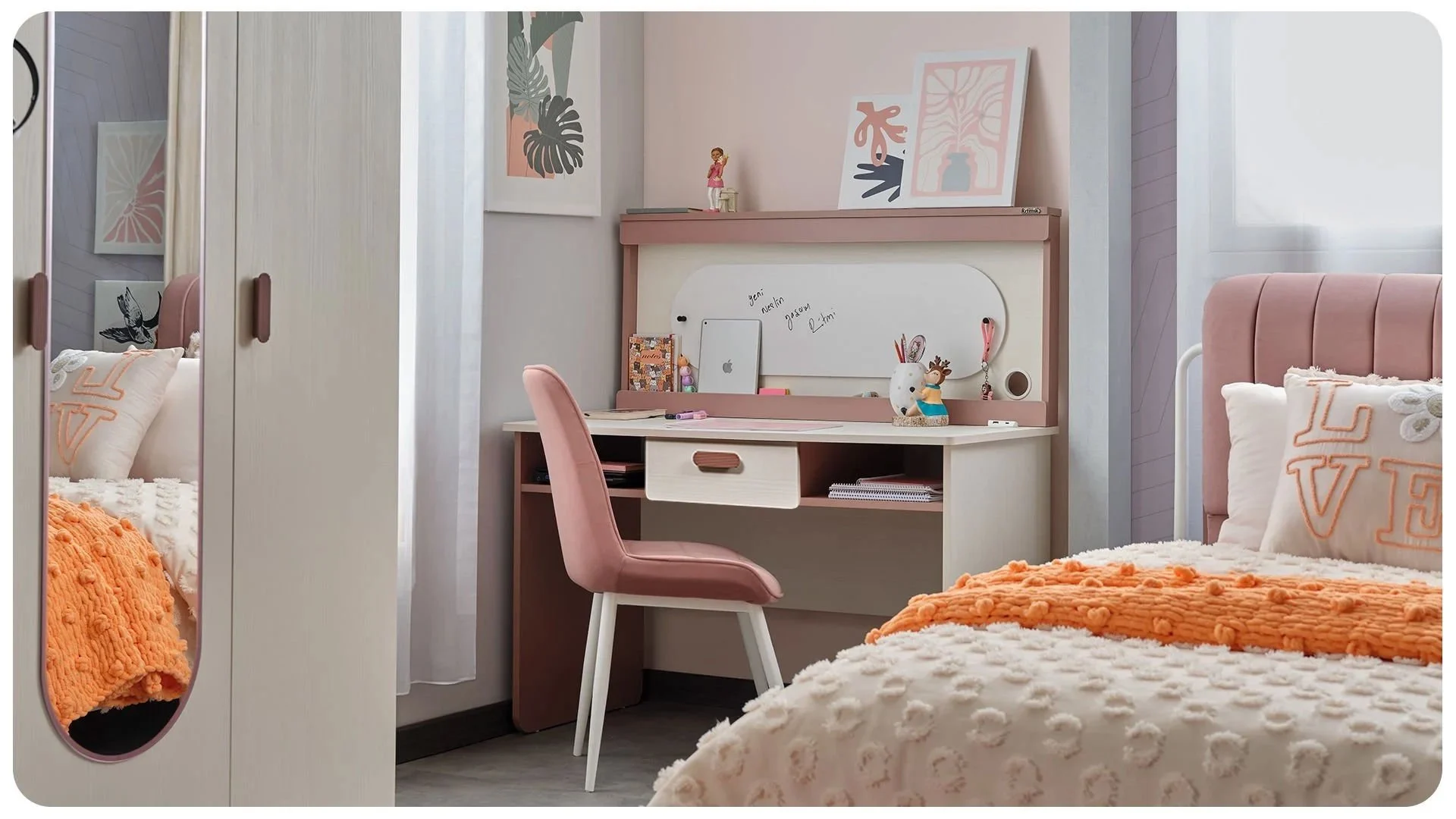Δώστε στο παιδί σας τον ιδανικό χώρο για μελέτη και δημιουργία με αυτό το μοντέρνο παιδικό γραφείο. Ο συνδυασμός απαλού ροζ και φυσικού ξύλου δημιουργεί μια ζεστή και ευχάριστη ατμόσφαιρα που ενθαρρύνει τη συγκέντρωση αλλά και τη φαντασία.
