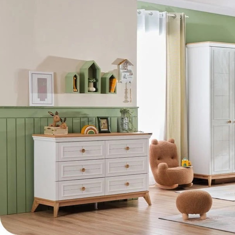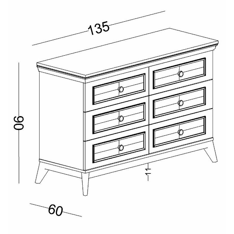Διαθέτει έξι ευρύχωρα συρτάρια σε διακριτικό λευκό χρώμα, με φυσικό ξύλο, που προσδίδουν μια ρομαντική και μοντέρνα πινελιά.