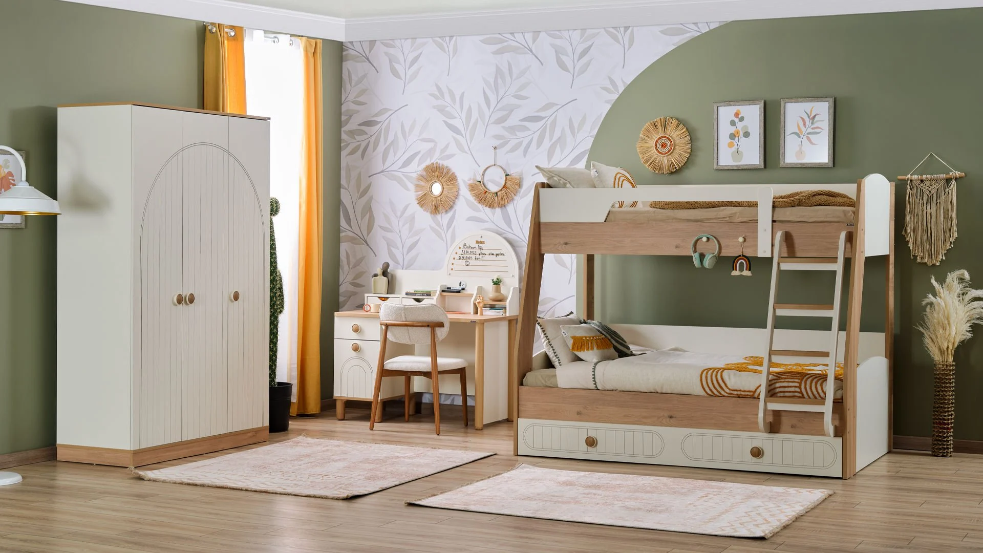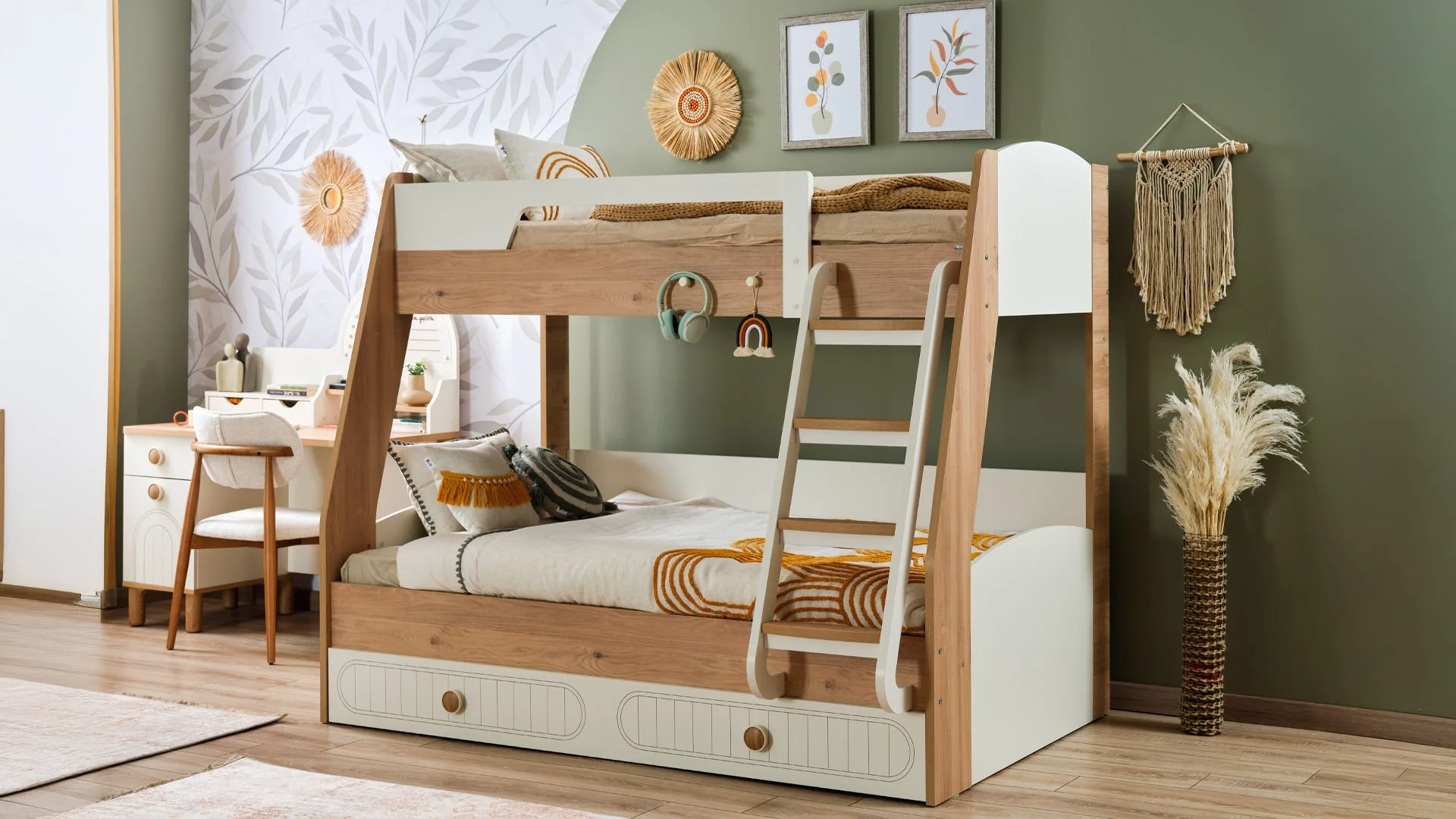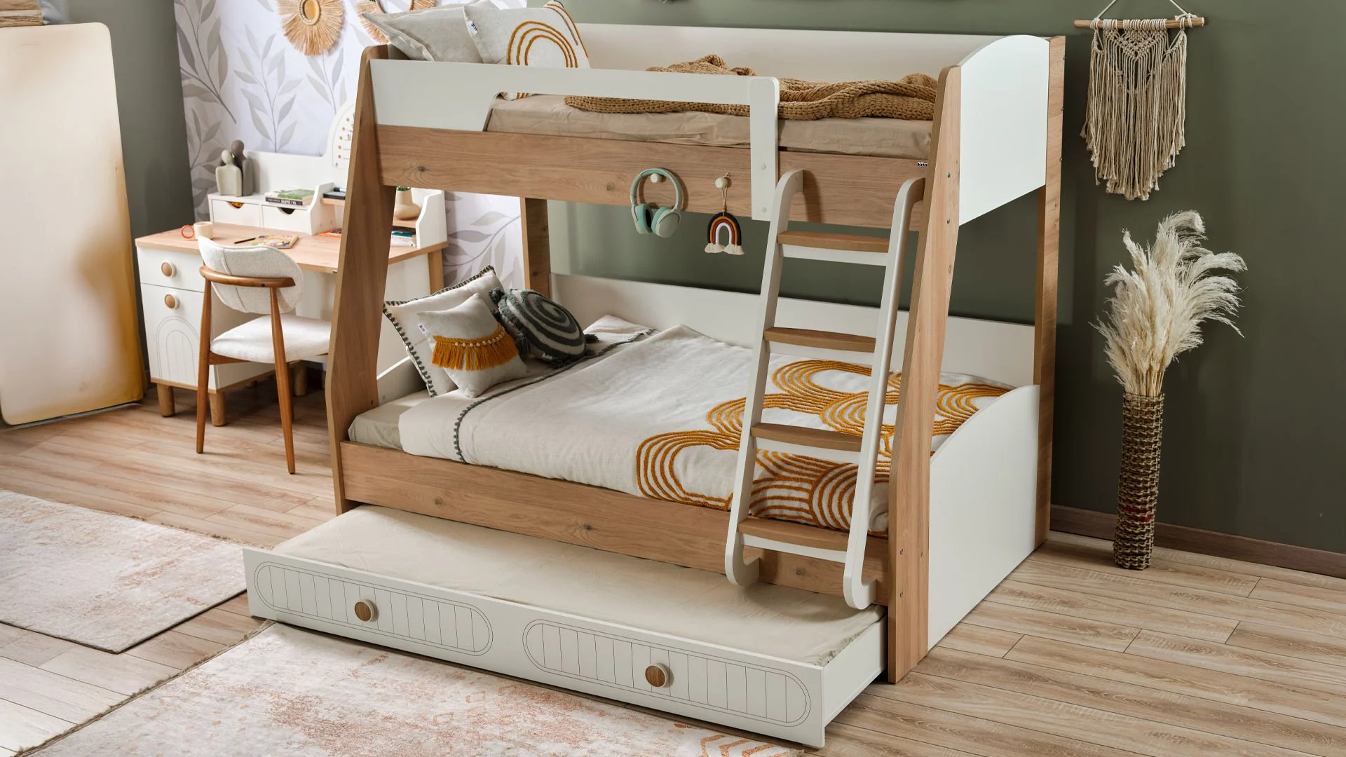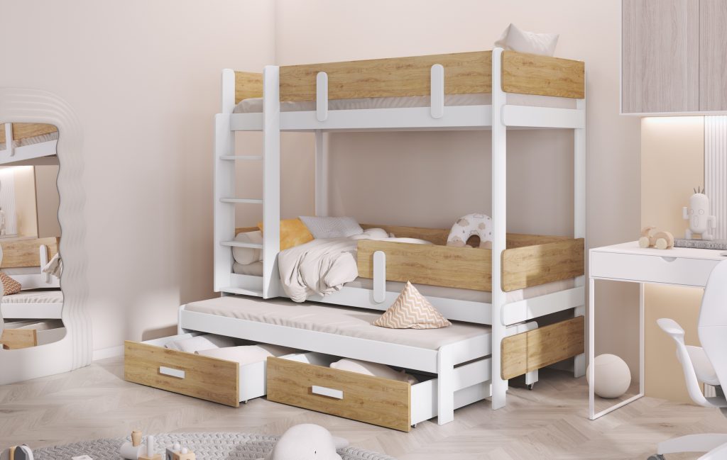 Ανακάλυψε τη μαγεία της Bohemlife ! Με πάνω κρεβάτι 90 x 200 εκ., κάτω κρεβάτι 1,20 x 200 εκ. και ένα έξυπνο συρόμενο κρεβάτι 90 x 190 εκ., όλα προσβάσιμα μέσω της στιλάτης και ασφαλούς σκάλας, το δωμάτιο γίνεται ένας χώρος για παιχνίδι, ξεκούραση και χαρούμενες στιγμές με φίλους ή αδέρφια. Ανθεκτική, πρακτική και γεμάτη στυλ – η Bohemlife μεγαλώνει μαζί με τα παιδιά!
