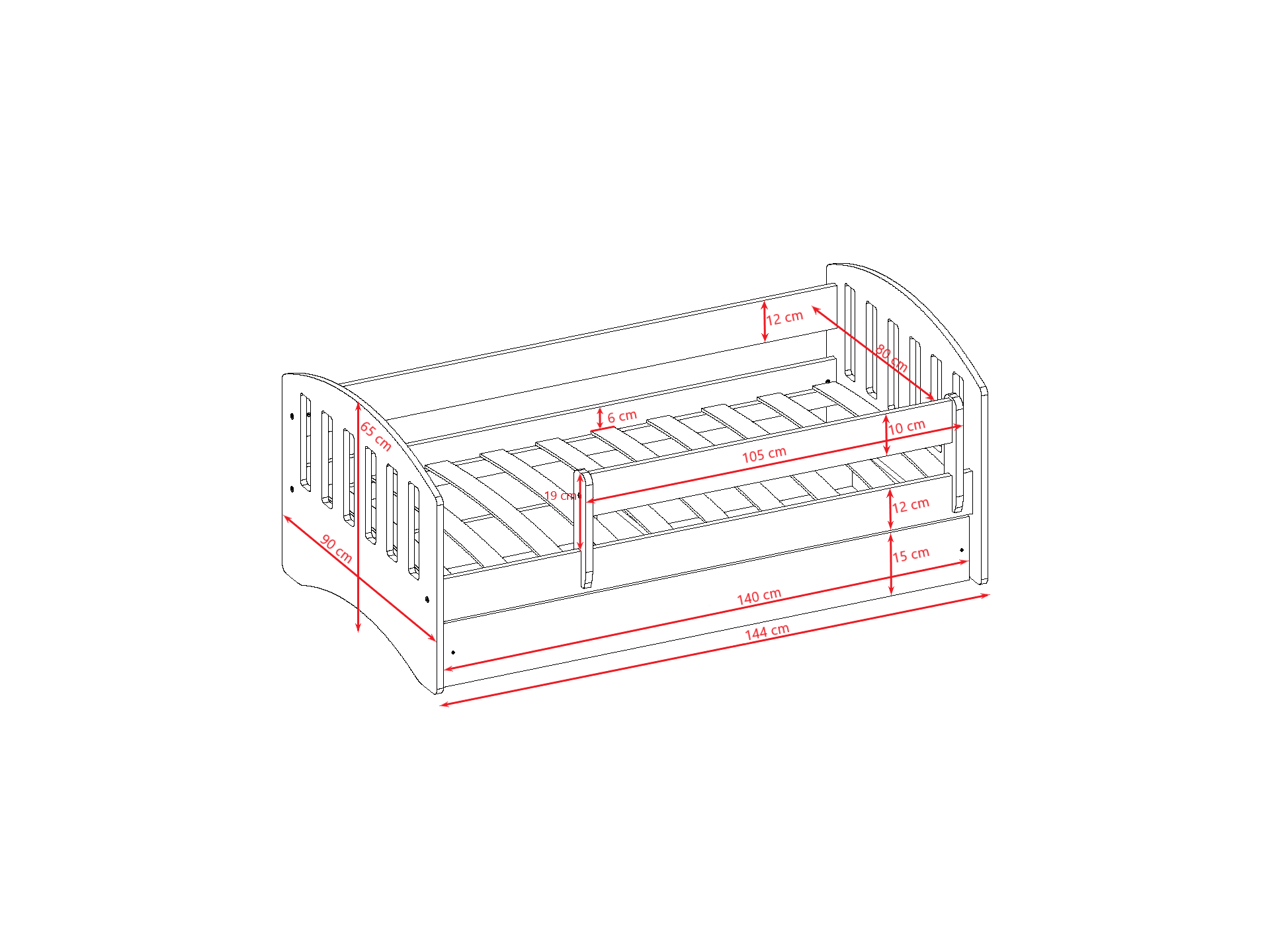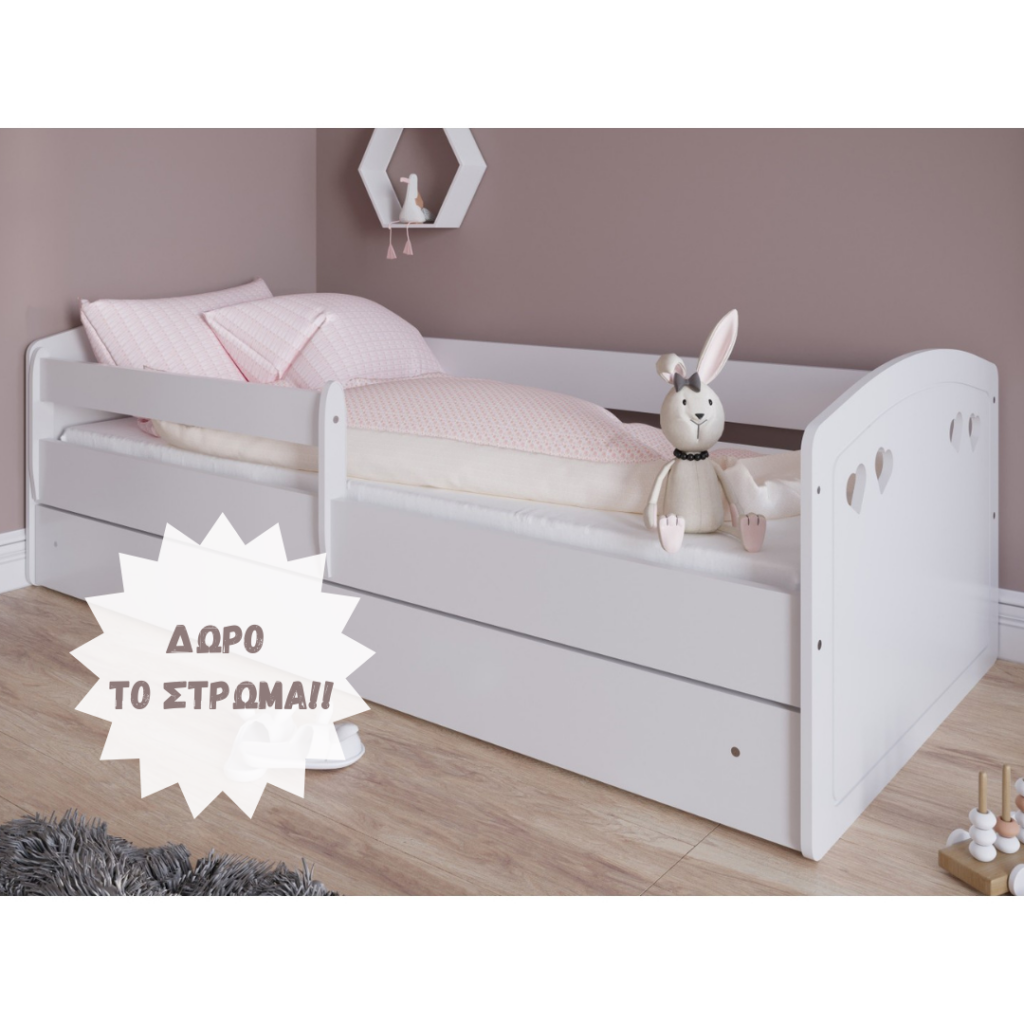 Το κρεβάτι έχει προστατευτικό κάγκελο που αφαιρείται και συρτάρια με ροδάκια.