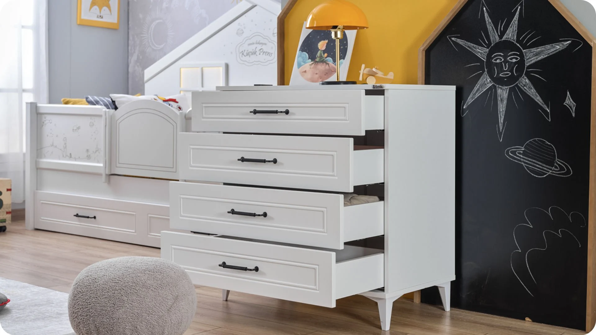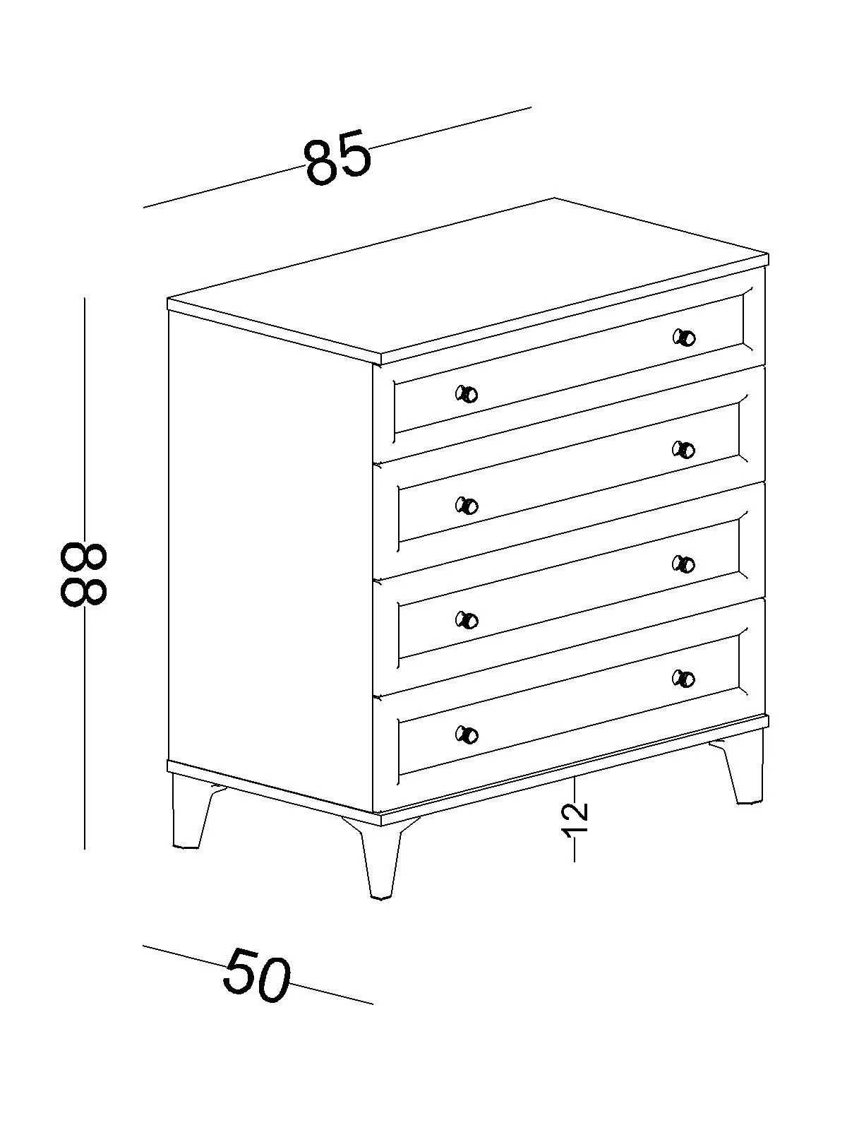 Διαθέτει τέσσερα ευρύχωρα συρτάρια σε άσπρο χρώμα που προσδίδουν μια ρομαντική και μοντέρνα πινελιά.
