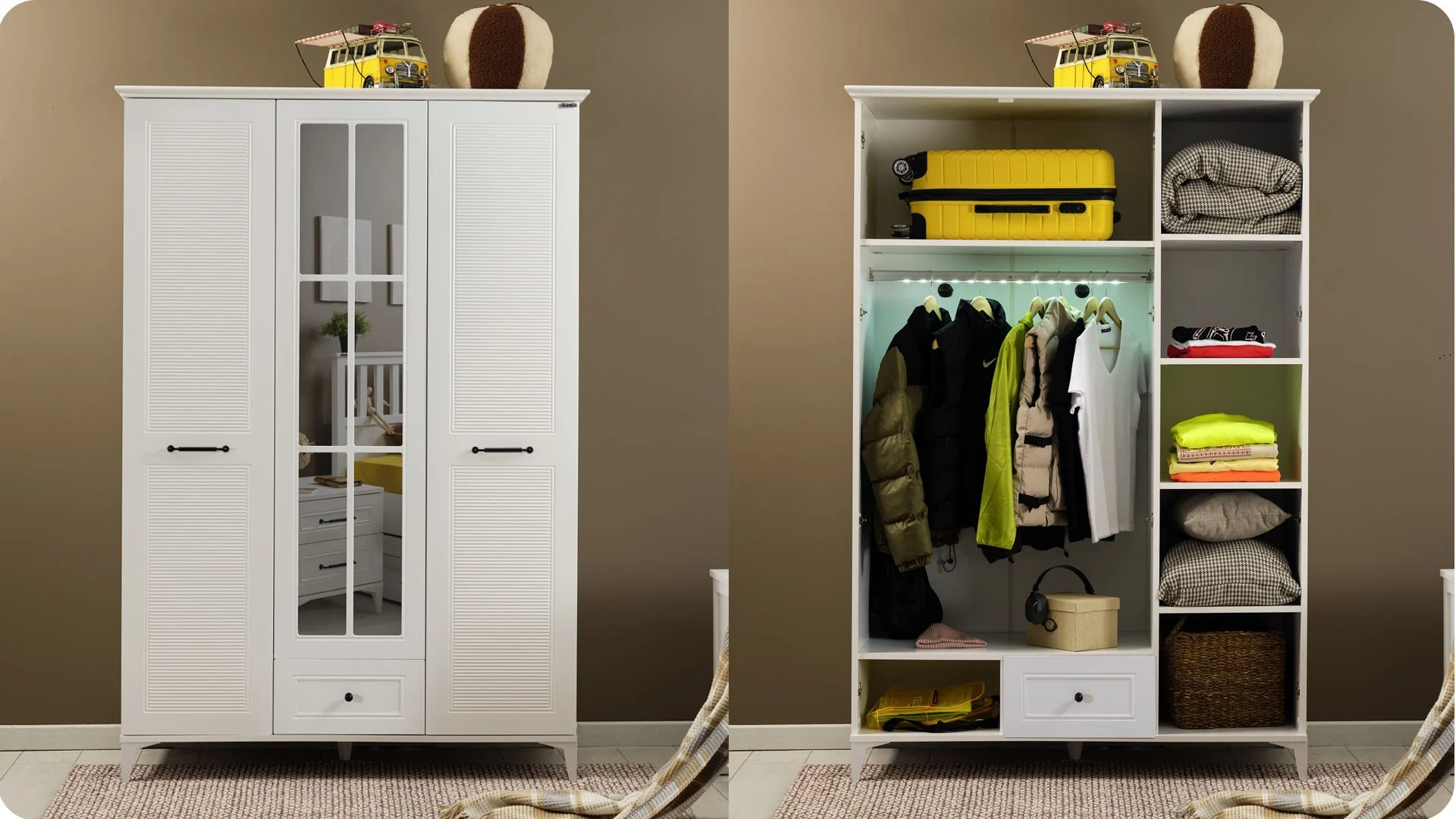 Η ντουλάπα διαθέτει τρία φύλλα που ανοίγουν για να αποκαλύψουν έναν ευρύχωρο εσωτερικό χώρο οργάνωσης. Περιλαμβάνει: