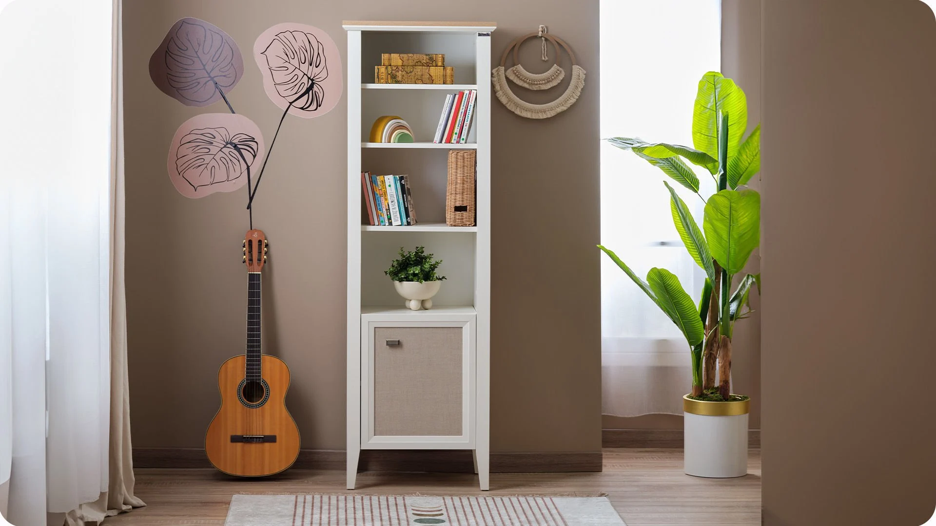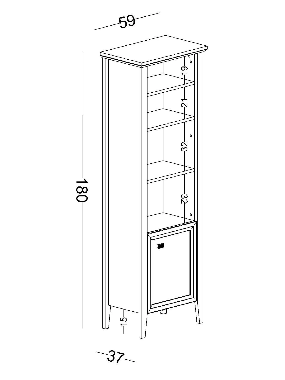 Είναι βαμμένη σε απαλή λευκή απόχρωση, με λεπτομέρειες σε γκρι απόχρωση στο επάνω μέρος . Διαθέτει τέσσερα ανοιχτά ράφια για αποθήκευση ή διακόσμηση, και ένα ντουλάπι στο κάτω μέρος για επιπλέον αποθήκευση.