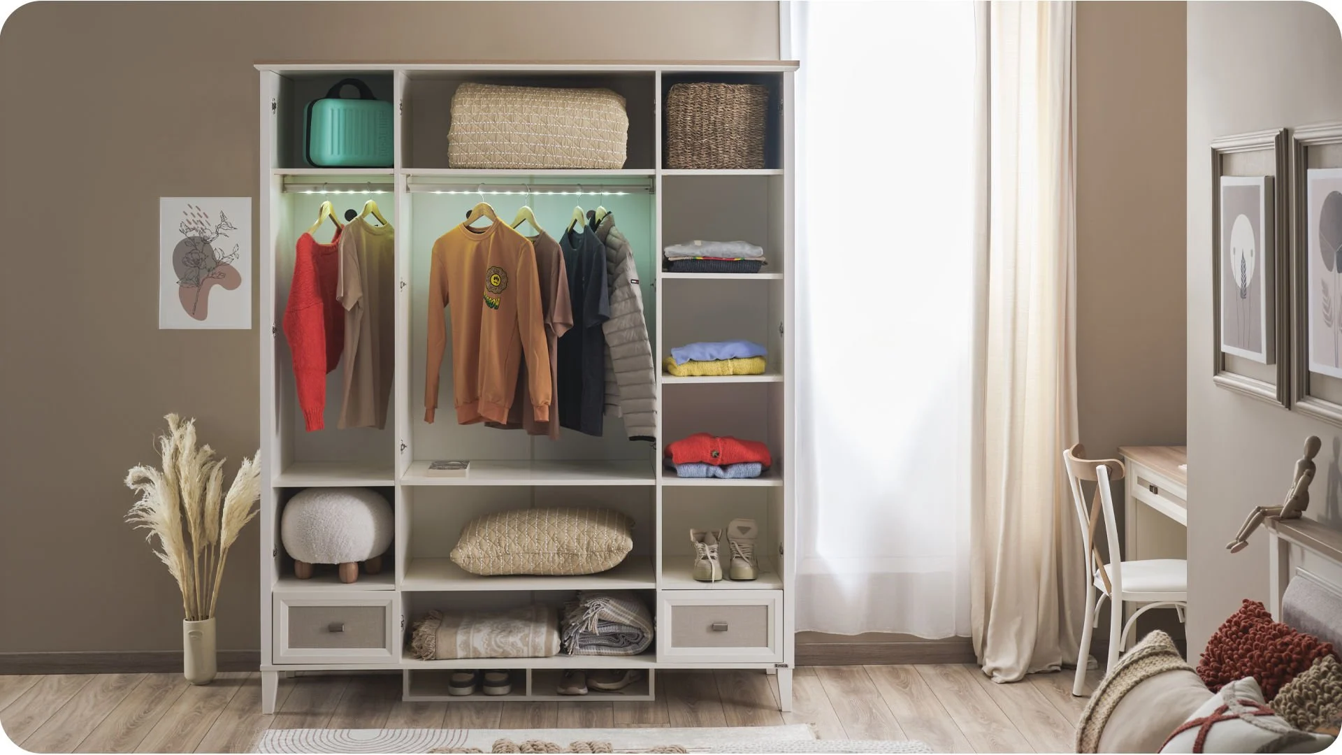 • Ράφια που προσφέρουν άφθονο χώρο για διπλωμένα ρούχα, κουτιά αποθήκευσης ή άλλα αντικείμενα.
