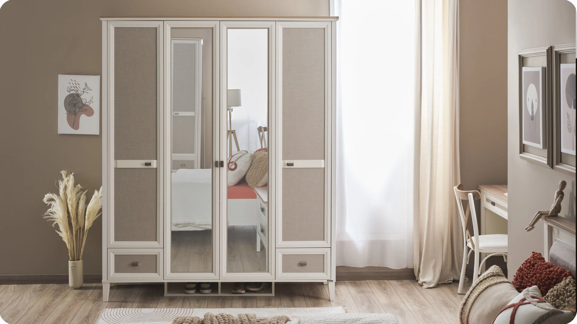 Η τετράφυλλη ντουλάπα με καθρέφτη  Orion συνδυάζει λειτουργικότητα και αισθητική, ιδανική για την οργάνωση κάθε χώρου.