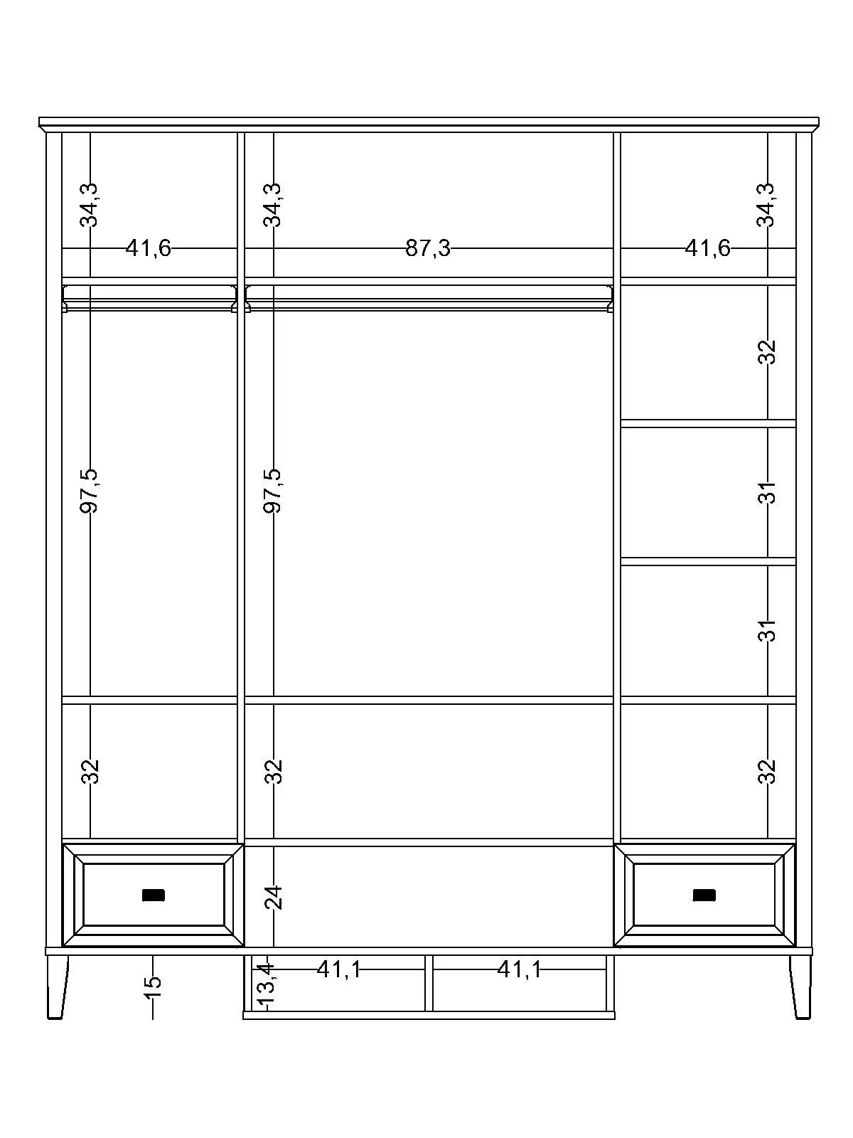 Η ντουλάπα διαθέτει τέσσερα φύλλα που ανοίγουν για να αποκαλύψουν έναν ευρύχωρο εσωτερικό χώρο οργάνωσης. Περιλαμβάνει: