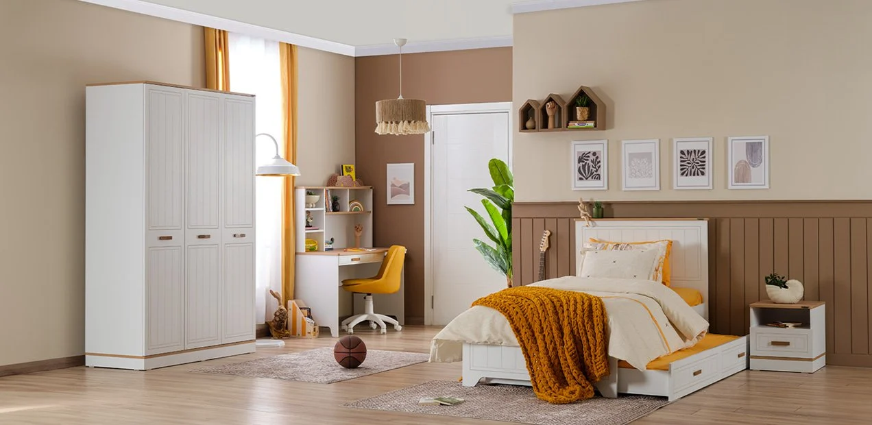 Η Τρίφυλλη Ντουλάπα Bella διαθέτει ράγες, ράφια και συρτάρια με μηχανισμούς soft-close για αθόρυβη χρήση, και ταιριάζει σε κάθε παιδικο ή/και εφηβικό υπνοδωμάτιο.