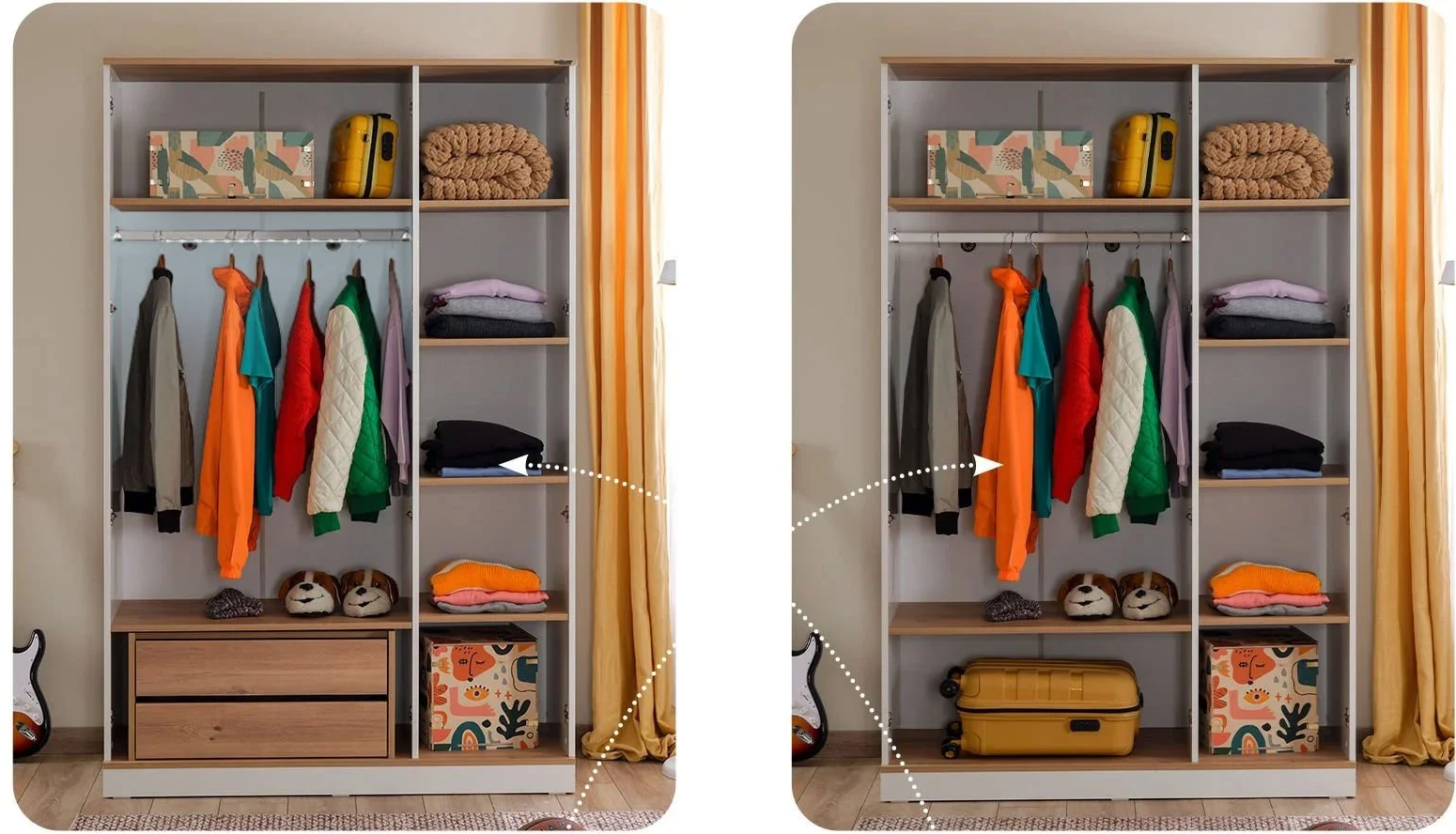 Η ντουλάπα διαθέτει τρία φύλλα που ανοίγουν για να αποκαλύψουν έναν ευρύχωρο εσωτερικό χώρο οργάνωσης. Περιλαμβάνει: