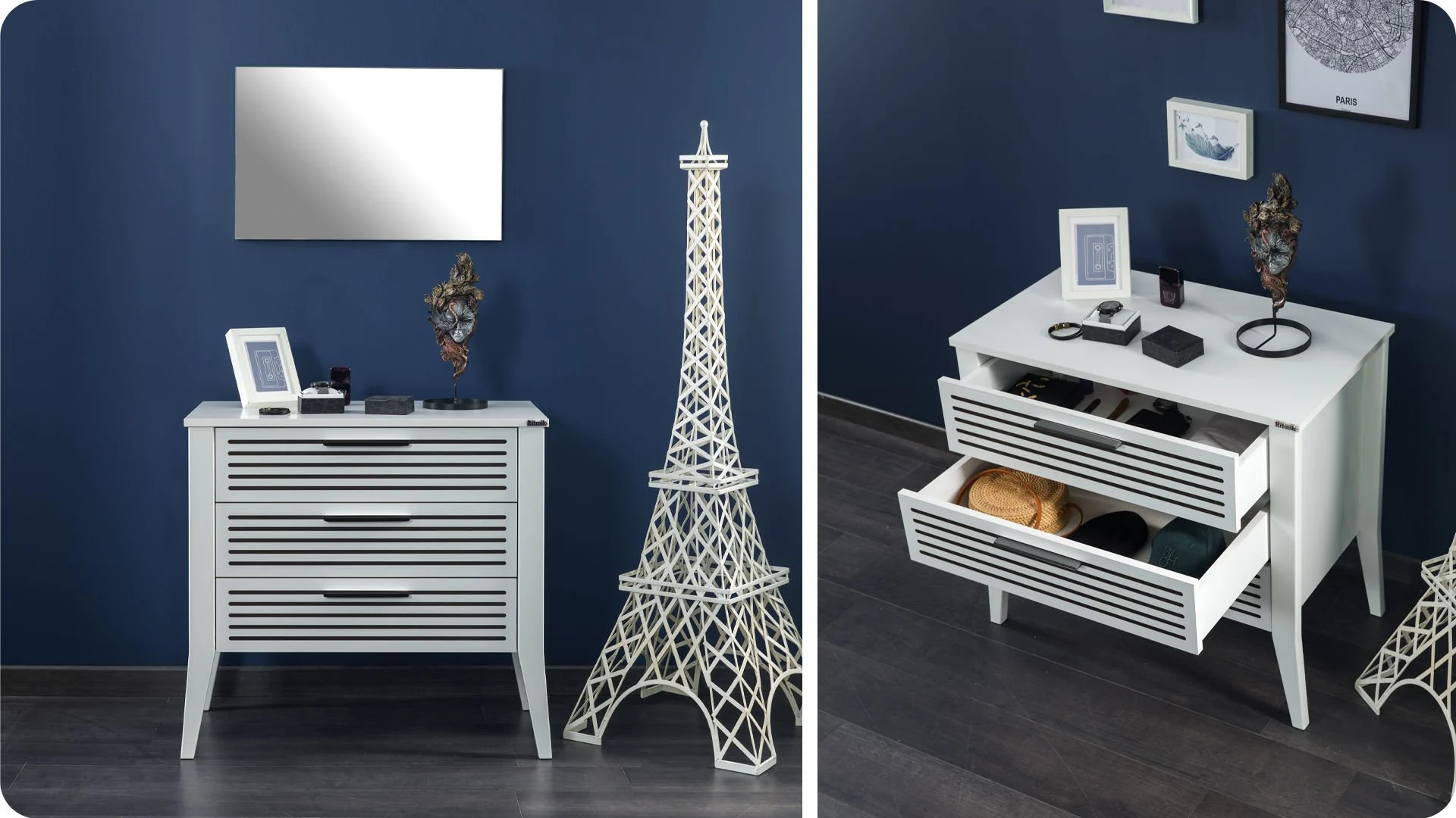 Διαθέτει τρία ευρύχωρα συρτάρια σε άσπρο χρώμα που προσδίδουν μια μοντέρνα πινελιά.