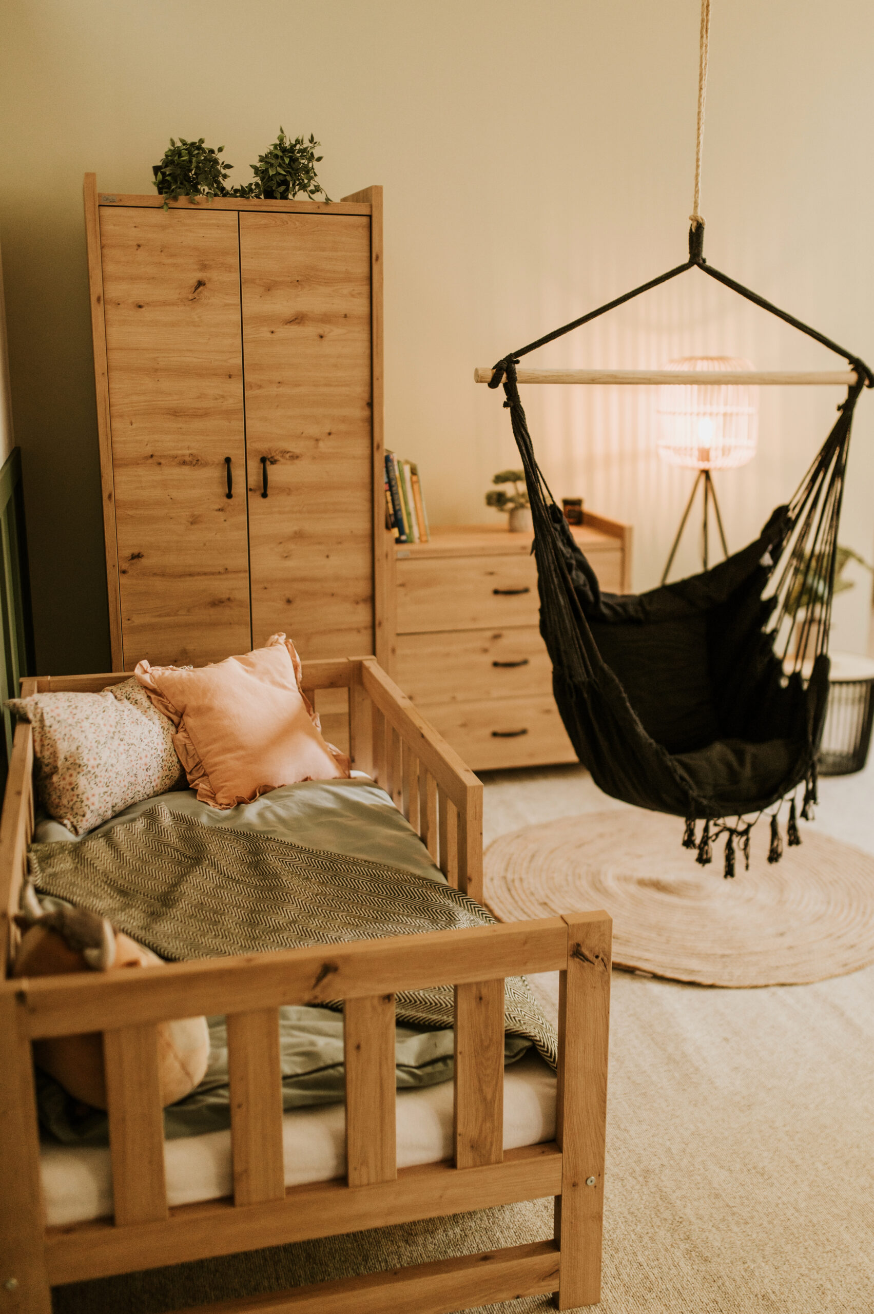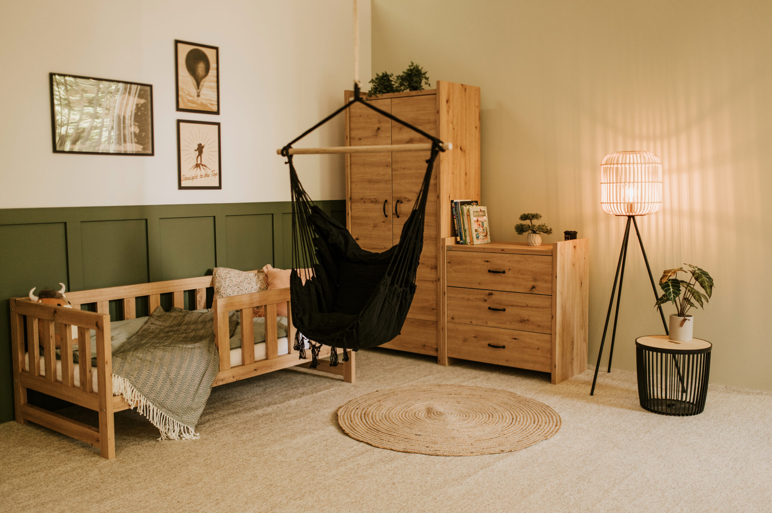 Ένα κομψό και ασφαλές κρεβάτι σχεδιασμένο ειδικά για παιδιά, με μοντέρνα γραμμή και λειτουργικότητα. Κατασκευασμένο από ανθεκτική MDF και επένδυση μελαμίνης, το κρεβάτι διατίθεται σε dab / oak χρώμα, προσφέροντας μια διαχρονική αισθητική που ταιριάζει εύκολα σε κάθε παιδικό δωμάτιο.