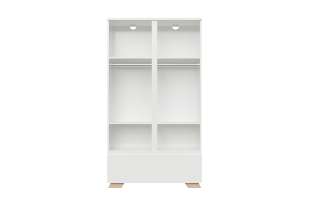 Άνετη και καλαίσθητη η βρεφική ντουλάπα Sofie διαθέτει: Τέσσερα ράφια Μία ράγα Ένα ευρύχωρο συρτάρι με οδηγούς Χρώμα: λευκό- φυσικό Υλικό: μοριοσανίδα Διαστάσεις: 117x50x180εκ.