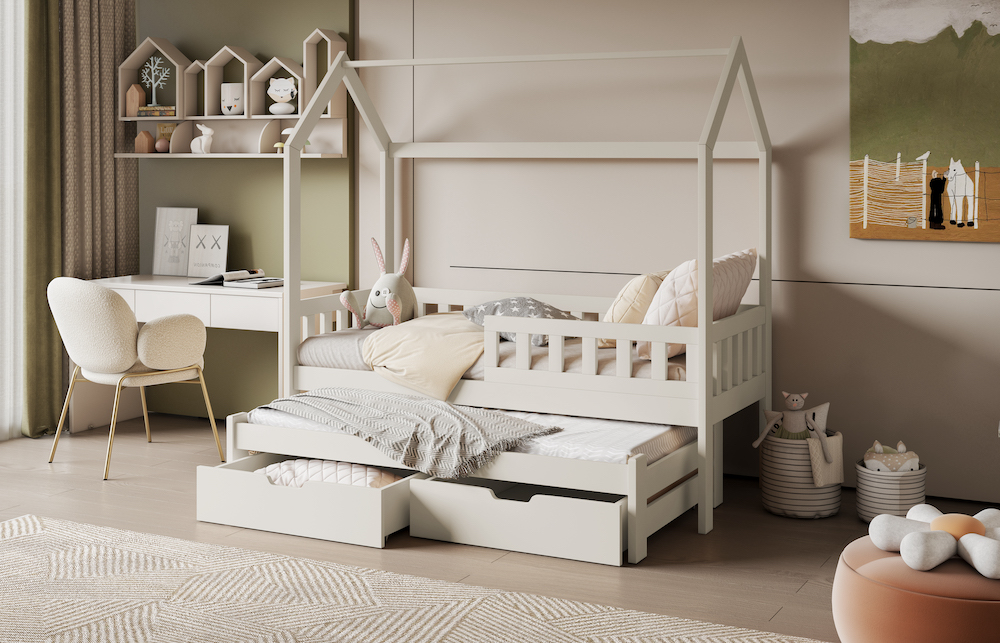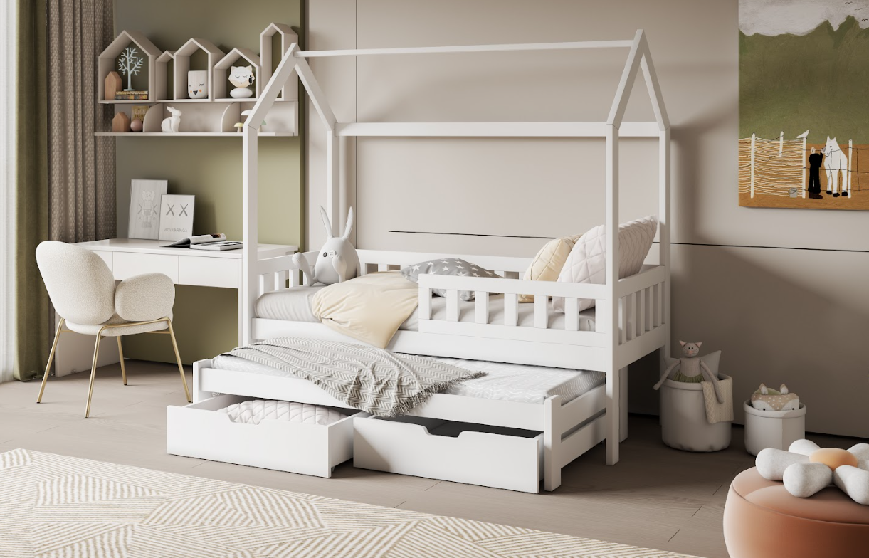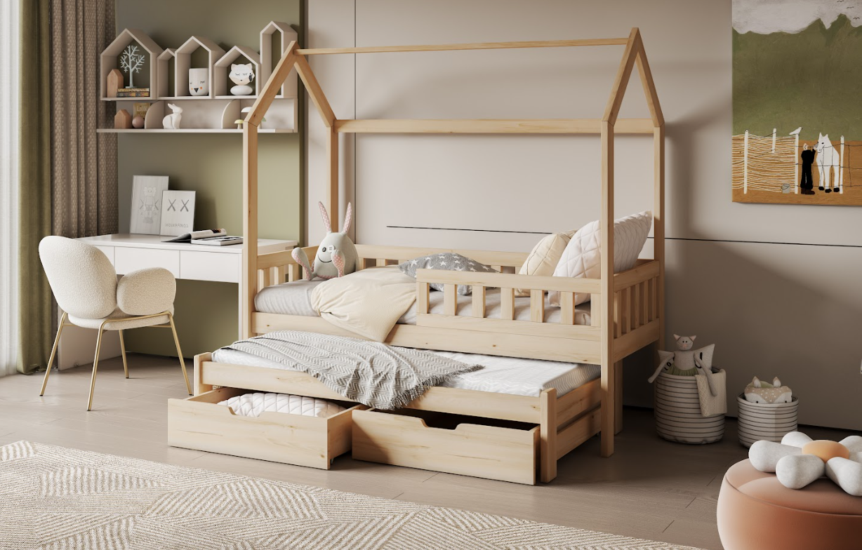 Δώστε στο παιδί σας έναν ζεστό, φυσικό και λειτουργικό χώρο ύπνου με το παιδικό κρεβάτι Tobi! Κατασκευασμένο αποκλειστικά από μασίφ ξύλο πεύκου, συνδυάζει αντοχή, υψηλή αισθητική και πρακτικότητα. Minimal & μοντέρνος σχεδιασμός: Ο σκελετός τύπου “σπιτάκι” χαρίζει μια παραμυθένια αίσθηση στο παιδικό δωμάτιο. Το Tymon είναι το ιδανικό κρεβάτι για κάθε σύγχρονη οικογένεια που αναζητά άνεση, ποιότητα και εργονομία. Δώστε στο παιδί σας ένα χώρο που θα λατρέψει! ➡ Χαρακτηριστικά: ✔ Περιλαμβάνονται αναλυτικές οδηγίες συναρμολόγησης ✔ Συρτάρια με ροδάκια, ελεύθερα, χωρίς οδηγούς ✔ Συρόμενο κρεβάτι με ροδάκια στα πίσω πόδια, χωρίς οδηγούς, δεν ανυψώνεται.