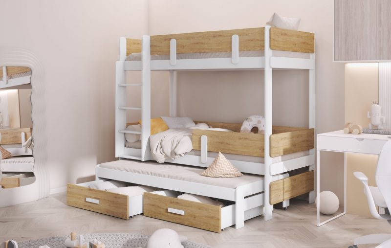 Η ETORRE 3 είναι μια ανθεκτική και στιβαρή κουκέτα που κοιμίζει 3 παιδιά! Κατασκευασμένη εξ ολοκλήρου από μασίφ ξύλο! Είναι περασμένη τρεις φορές με βερνίκι που δεν λεκιάζει! Προστατευτικά κάγκελα περιμετρικά, πράγμα που την καθιστά ασφαλή για χρήση και από πολύ μικρά παιδάκια! Περιλαμβάνει: – Δύο μεγάλα συρτάρια αποθήκευσης με ροδάκια! – Συρόμενο κρεβάτι – Τάβλες – Προστατευτικό κάγκελο στο κάτω κρεβάτι – Αναλυτικές οδηγίες συναρμολόγησης Το προϊόν παραδίδεται αμοντάριστο σε κουτιά. Διαθέσιμη υπηρεσία συναρμολόγησης με επιπλέον κόστος.