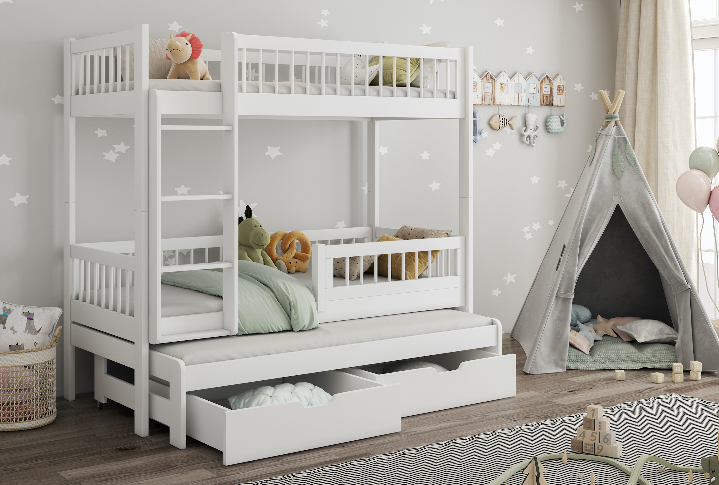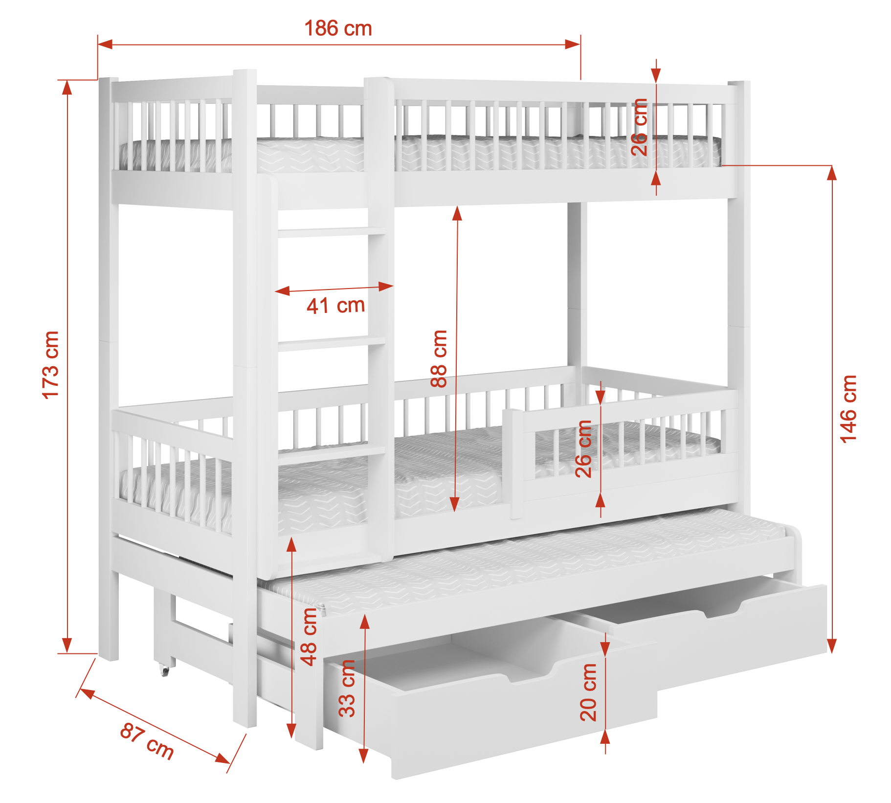 Εξωτερικές διαστάσεις κρεβατιού (Μ/Β/Υ) 186x87x173εκ. Μέγεθος άνω / κάτω στρώματος: 180×80εκ. ΠΡΟΣΟΧΗ: Μέγεθος συρόμενου στρώματος 167×80εκ. Υψος προστατευτικών καγκέλων: 26εκ Το ύψος στο οποίο βρίσκεται το άνω στρώμα 146εκ. Το ύψος στο οποίο βρίσκεται το μεσαίο στρώμα 48εκ. Απόσταση ανάμεσα στα δύο κρεβάτια: 88εκ Εξωτερικές διαστάσεις κουκέτας (Μ/Β/Υ) 206x97x173εκ. Μέγεθος άνω / κάτω στρώματος: 200×90εκ. ΠΡΟΣΟΧΗ: Μέγεθος συρόμενου στρώματος : 187Χ90 εκ. Το κρεβάτι παραδίδεται αμοντάριστο σε κουτιά, περιλαμβάνονται αναλυτικές οδηγίες συναρμολόγησης. Διαθέσιμη υπηρεσία συναρμολόγησης με επιπλέον κόστος.