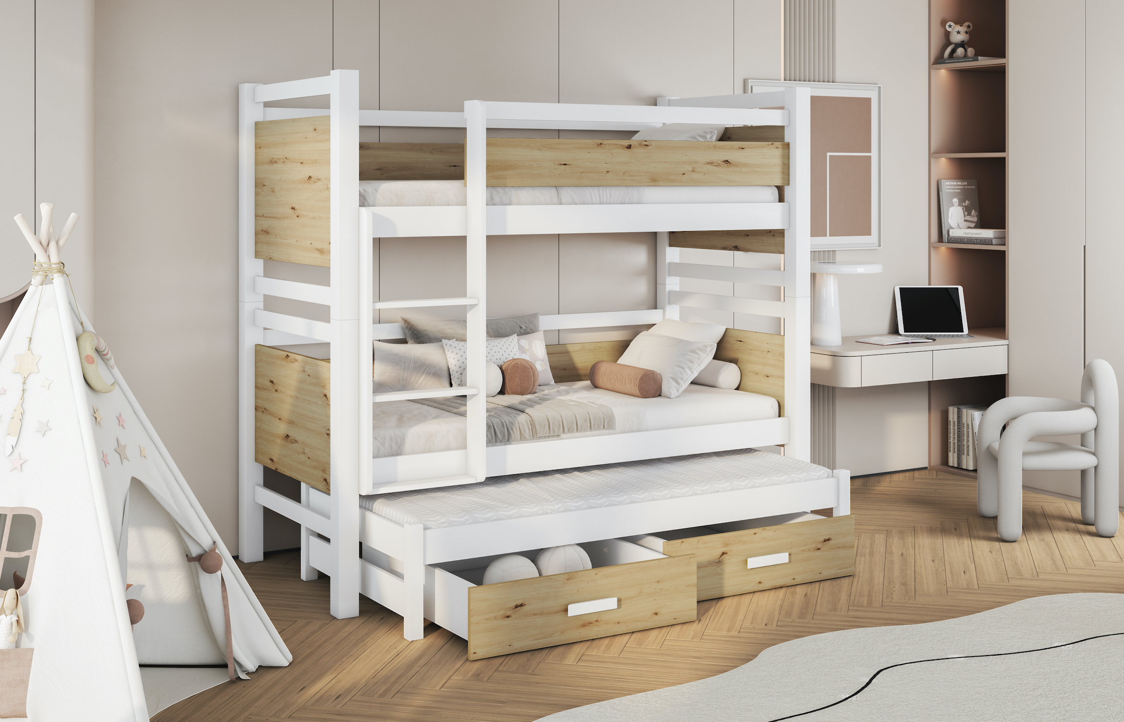Η κουκέτα JANIS 3 της εικόνας συνδυάζει μοντέρνο σχεδιασμό με λειτουργικότητα, αποτελώντας ιδανική επιλογή για παιδικά και εφηβικά δωμάτια.