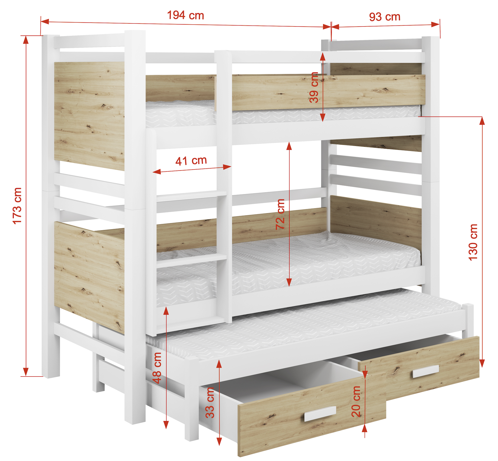 Εξωτερικές Διαστάσεις κουκέτας  για στρώματα 180×80εκ.: (Μ/Β/Υ) 194 x 93 x 185 εκ.
