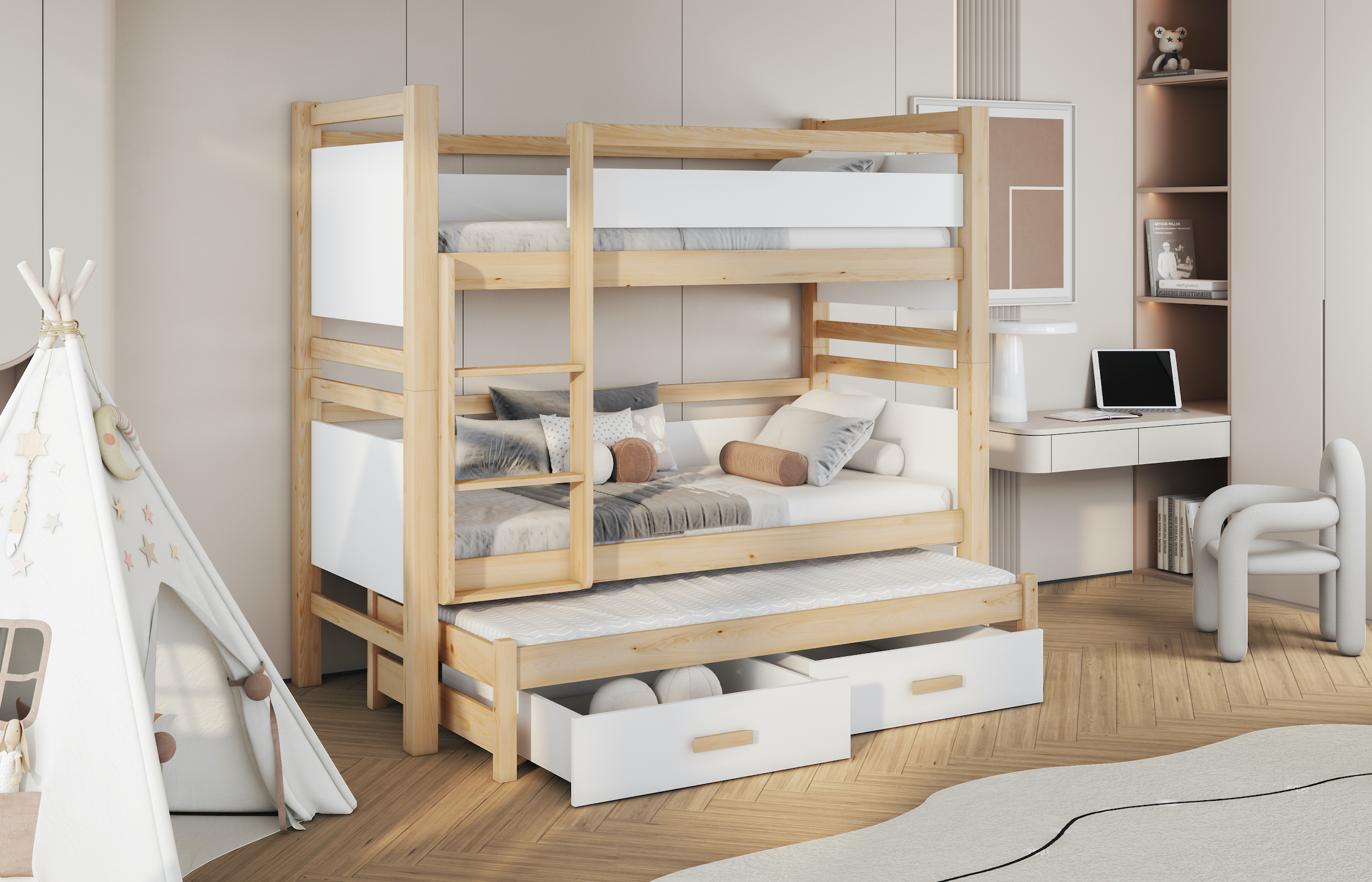 Η κουκέτα Nottur της εικόνας συνδυάζει μοντέρνο σχεδιασμό με λειτουργικότητα, αποτελώντας ιδανική επιλογή για παιδικά και εφηβικά δωμάτια. Η κουκέτα Nottur είναι ιδανική για όσους επιθυμούν έναν πρακτικό, ασφαλή και καλαίσθητο χώρο ύπνου για παιδιά και εφήβους.