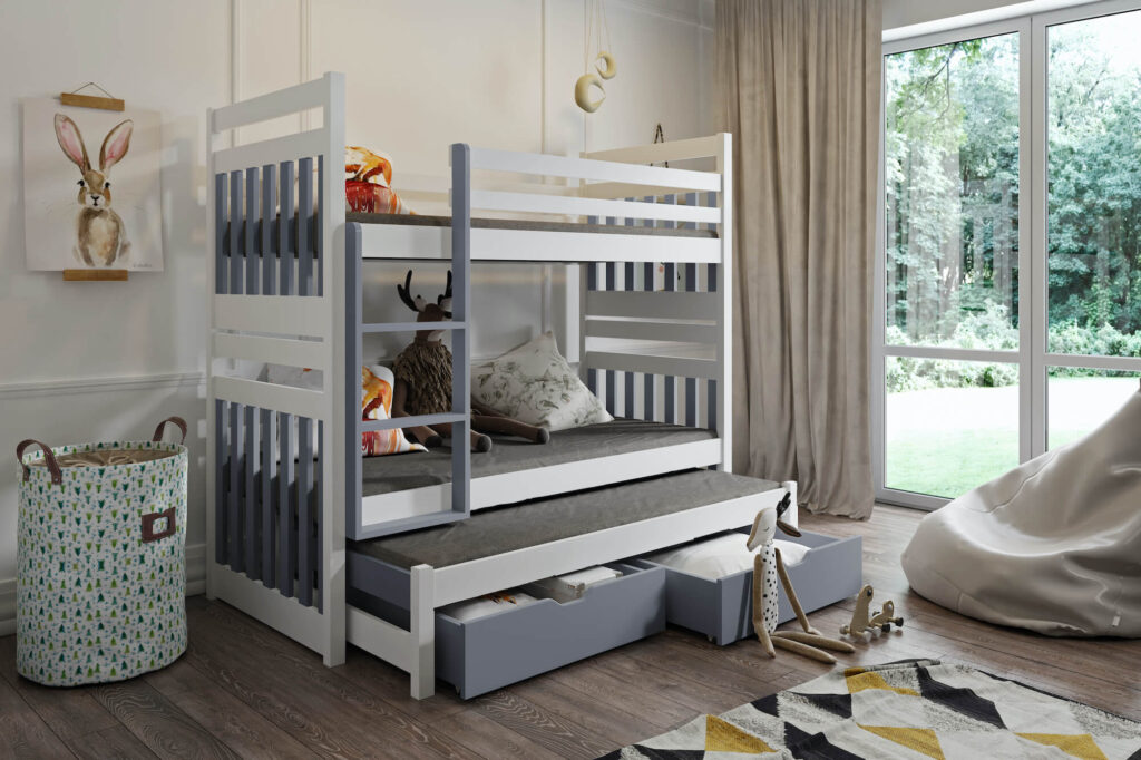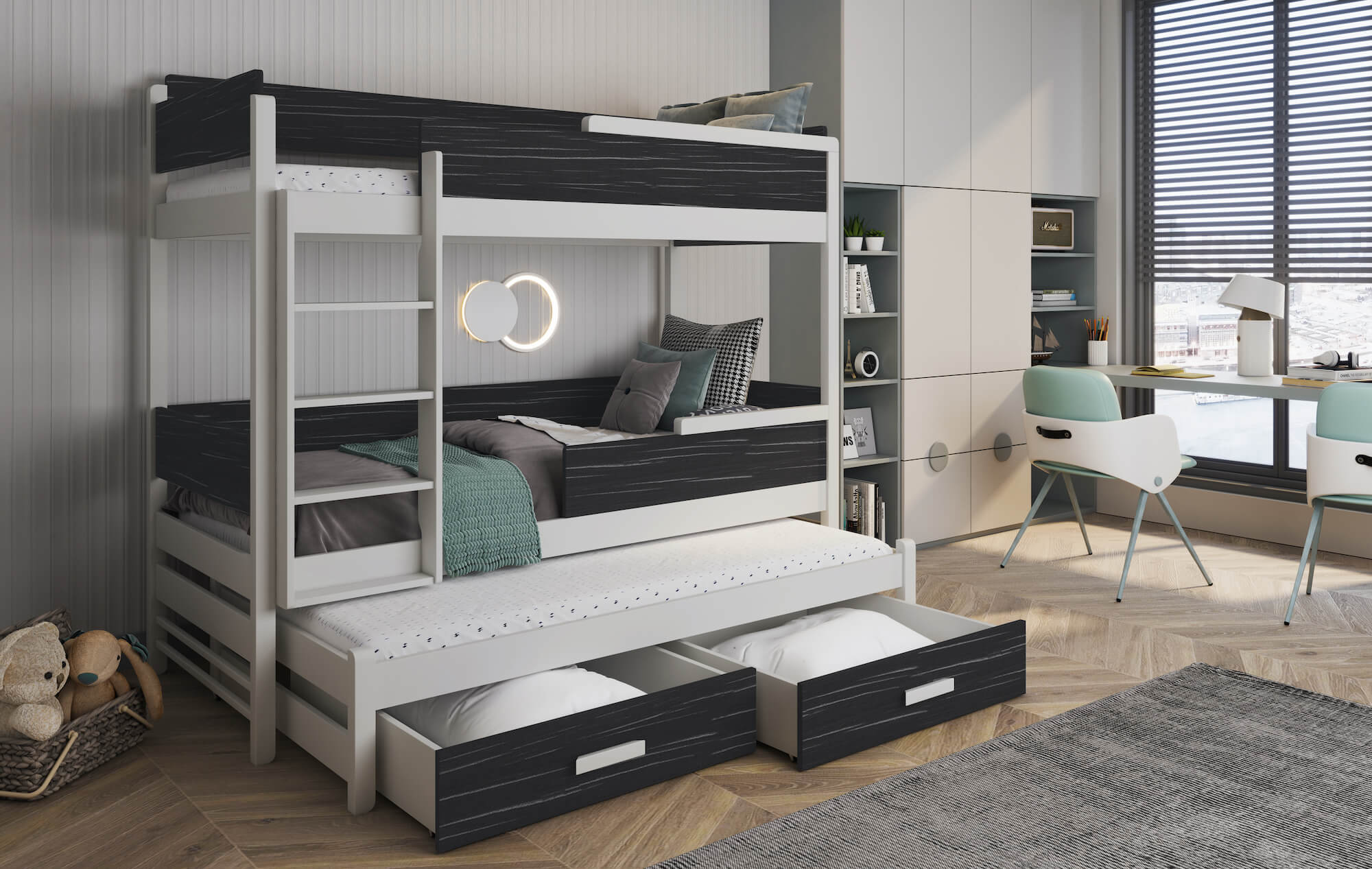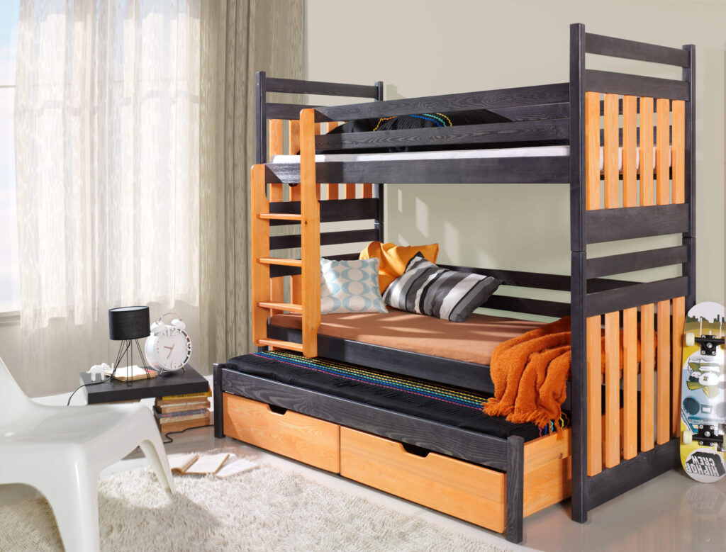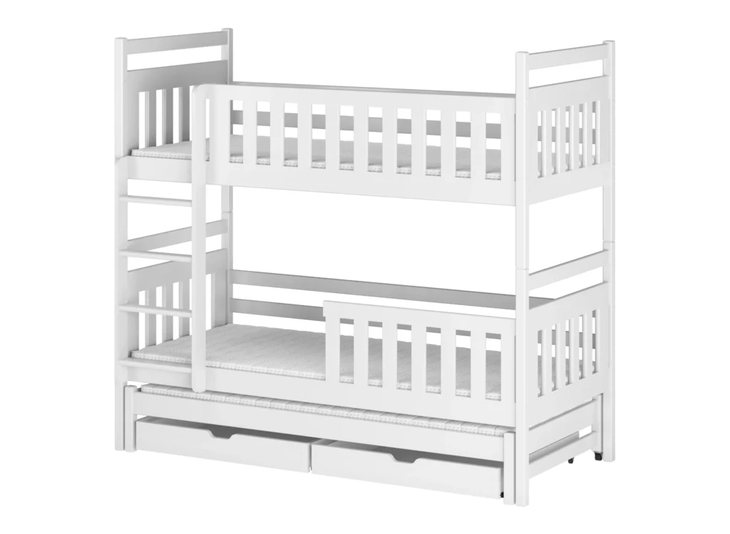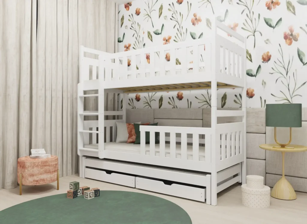 H QUATRO 3 είναι μια όμορφη και ανθεκτική κουκέτα! Κοιμίζει 3 άτομα, αφού διαθέτει συρόμενο αυτόνομο κρεβάτι στο κάτω μέρος! Κατασκευασμένη από μασίφ ξύλο και μοριοσανίδα! Είναι περασμένη τρεις φορές με βερνίκι που δεν λεκιάζει! Γερή και στιβαρή κατασκευή που θα σας μείνει για πάντα! Προστατευτικά κάγκελα περιμετρικά, πράγμα που την καθιστά ασφαλή για χρήση και από πολύ μικρά παιδάκια! Περιλαμβάνονται: – Δύο μεγάλα συρτάρια αποθήκευσης με ροδάκια – Συρόμενο κρεβάτι – Τάβλες – Αναλυτικές οδηγίες συναρμολόγησης