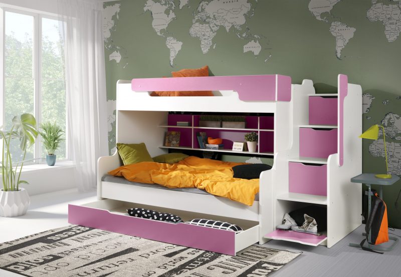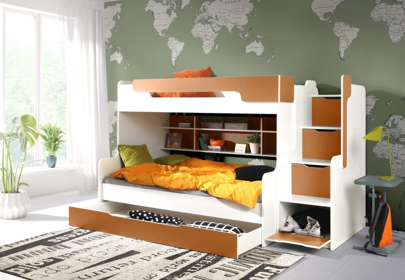 Το Harry είναι η τελευταία έκδοση της σειράς κουκέτες 2 ατόμων. Ο σχεδιαστής αυτού του μοντέλου πέραν του μοντέρνου σχεδιασμού φρόντισε και για τη λειτουργικότητά του. Το αποτέλεσμα αυτό επιτεύχθηκε με την προσθήκη ενός πρακτικού ραφιού στον πίσω τοίχο του κρεβατιού. Επιπλέον, η τοποθέτηση ραφιών που κλειδώνουν στα σκαλιά του κρεβατιού κάνει τις σκάλες να χρησιμεύουν και ως βιβλιοθήκη, μετατρέποντας αυτό το μοντέλο ακόμα πιο ελκυστικό δημιουργώντας έναν επιπλέον αποθηκευτικό χώρο. Οι σκάλες για να ανεβείτε μπορούν να ρυθμιστούν και στα δεξιά και στα αριστερά. Η κουκέτα είναι κατασκευασμένη από μοριοσανίδα και έχει στοιχεία από λακαριστό ξύλο. – Τα στρώματα δεν περιλαμβάνονται (πωλούνται ξεχωριστά) Διαστάσεις στρωμάτων: Διαστάσεις κατασκευής (κρεβάτι και σκαλιά) : 260 x 129 x 155 Διαστάσεις κρεβατιού: 206 x 129 x 155 Διαστάσεις σκαλιών: 54 x 104 x 155