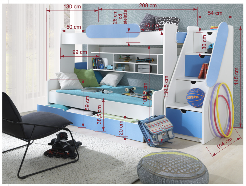 Διαστάσεις κατασκευής (κρεβάτι και σκαλιά) : 262 x 130 x 145