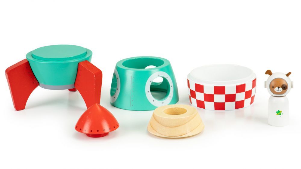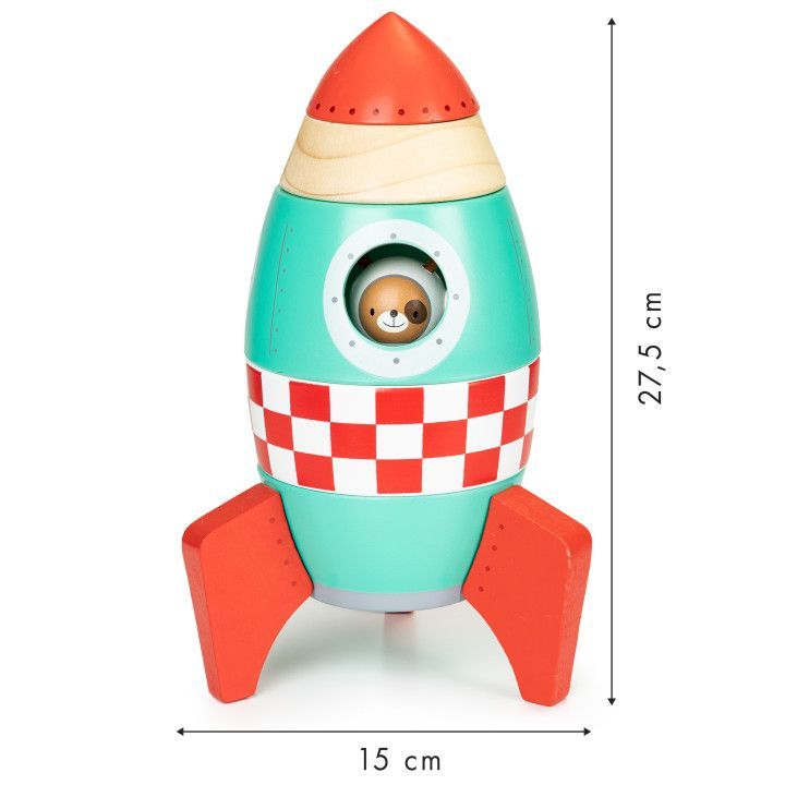 Το σετ αποτελείται από 6 ξύλινα στοιχεία που πρέπει να τοποθετηθούν το ένα πάνω στο άλλο για να δημιουργήσουν έναν πολύχρωμο πύραυλο. Το παιχνίδι αναπτύσσει τις δεξιότητες λεπτής κινητικότητας και τη φαντασία του παιδιού. Πιστοποίηση CE, EN71, SGS. Κατάλληλο από 2+.
