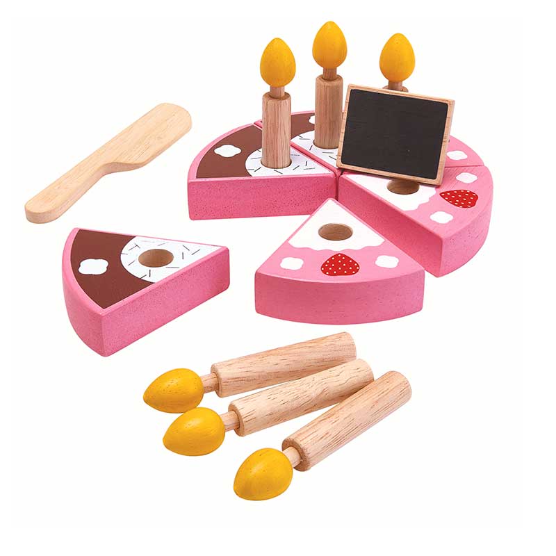 Το σετ αποτελείται από μια τούρτα δύο όψεων με διαφορετική επικάλυψη, 1 πιάτο, 1 μαχαίρι, 1 μπάρα μαύρης σοκολάτας και 6 αφαιρούμενα κεριά. Η τούρτα μπορεί να κοπεί σε 6 κομμάτια. Επίσης το παιδί μπορεί να γράψει το όνομα του πάνω στη μπάρα σοκολάτας με κιμωλία. Αυτό το παιχνίδι είναι ιδανικό για τη διδασκαλία των κλασμάτων και την ανάπτυξη της φαντασίας του παιδιού. Διαστάσεις: 15.8 x 15.8 x 1.2 cm
