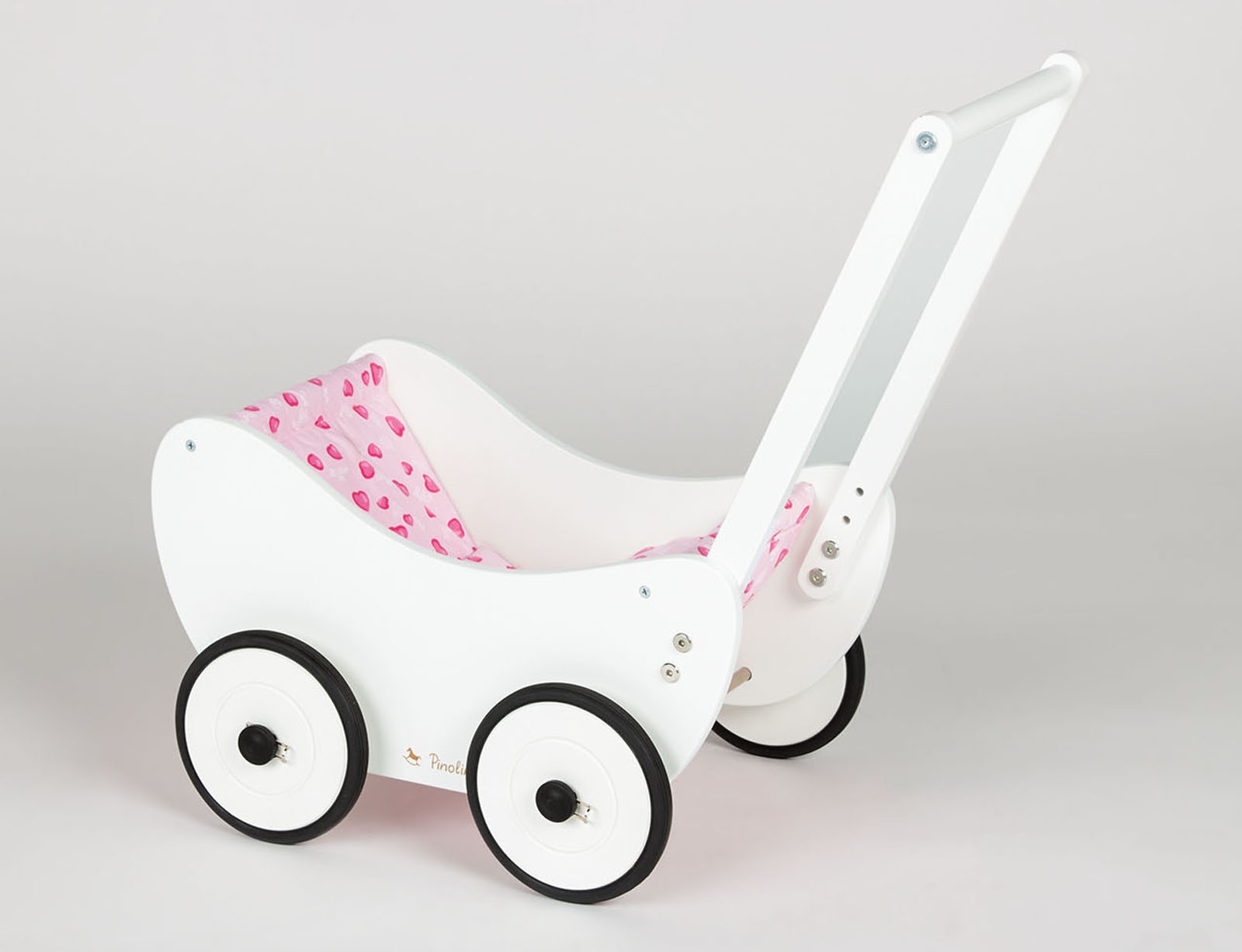 Το ξύλινο καρότσι για κούκλες Trixi Pinolino είναι η ιδανική επιλογή για τα πρώτα βήματα του παιδιού σας, προσφέροντας ασφάλεια και διασκέδαση. Ιδανικό για να μεταφέρουν τις αγαπημένες τους κούκλες και λούτρινα, ενθαρρύνει το δημιουργικό παιχνίδι και τη φαντασία. Περιλαμβάνει και πάπλωμα Herzchen σε ροζ απόχρωση. Με κομψό σχεδιασμό σε λευκό χρώμα και στιβαρή ξύλινη κατασκευή, αυτό το καρότσι θα γίνει ο αγαπημένος σύντροφος παιχνιδιού των μικρών σας. Χάρη στο ενσωματωμένο σύστημα φρένων, εξασφαλίζει σταθερότητα και ελεγχόμενη κίνηση, βοηθώντας τα παιδιά να αναπτύξουν τις κινητικές τους δεξιότητες με ασφάλεια. Οι άνετες διαστάσεις του το καθιστούν εύχρηστο και κατάλληλο για παιδιά 1 έτους και άνω.