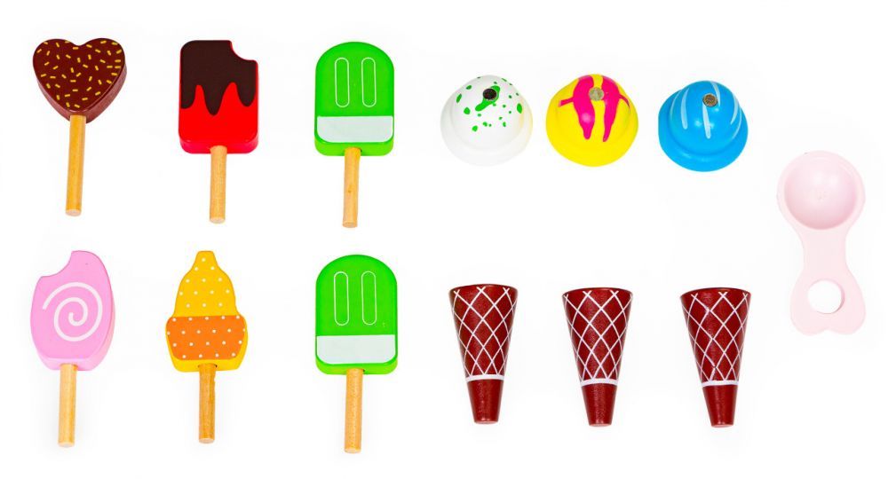 Ένα υπέροχο παιχνίδι που σας επιτρέπει να παίξετε το ρόλο ενός παγοτατζή. Το σετ περιλαμβάνει 6 παγωτά, τρεις γκοφρέτες και 3 διαφορετικές μεζούρες παγωτό και ένα κουτάλι για να τα βάζετε. Δεδομένου ότι οι γκοφρέτες και οι μπάλες παγωτού έχουν μαγνήτη, συνδέονται μεταξύ τους και μπορείτε να τις προσθέσετε χρησιμοποιώντας ένα κουτάλι, το οποίο έχει και μαγνήτη. Χάρη σε αυτό, η διασκέδαση θα γίνει ακόμα πιο εθιστική. Πιστοποιητικά CE, EN71. Κατάλληλο από 3+